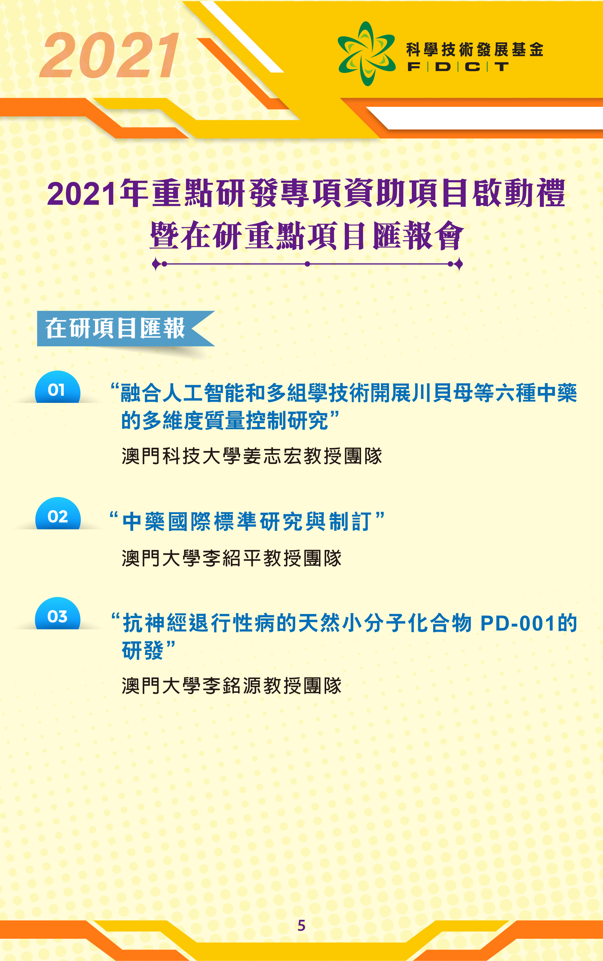 啟動禮後隨即舉行在研重點資助項目的匯報會,邀請了前年獲資助的三個項目的團隊匯報中期研究情況及階段性研究成果,項目分別為一、澳門科技大學姜志宏教授團隊 的“融合人工智能和多組學技術開展川貝母等六種中藥的多維度質量控制研究”;二、澳門大學李紹平教授團隊的“中藥國際標準研究與制訂”;三、澳門大學李銘源教授團隊的“抗神經退行性病的天然小分子化合物 PD-001的研發”。