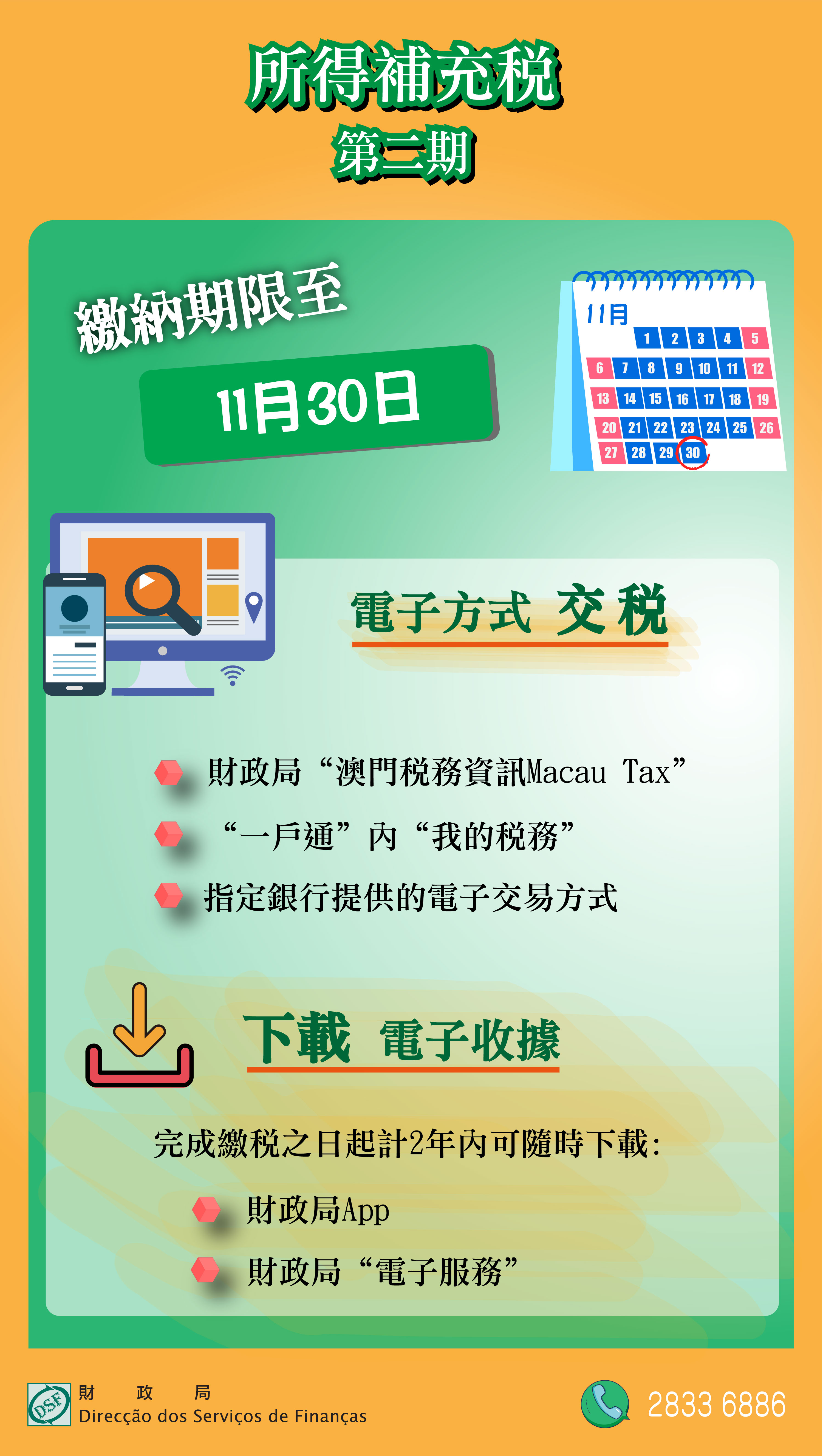 財政局提醒納稅人,繳納月份為11月之第二期所得補充稅,繳納期限至11月30日止,逾期繳納,將加徵過期利息及欠繳稅款百分之三。