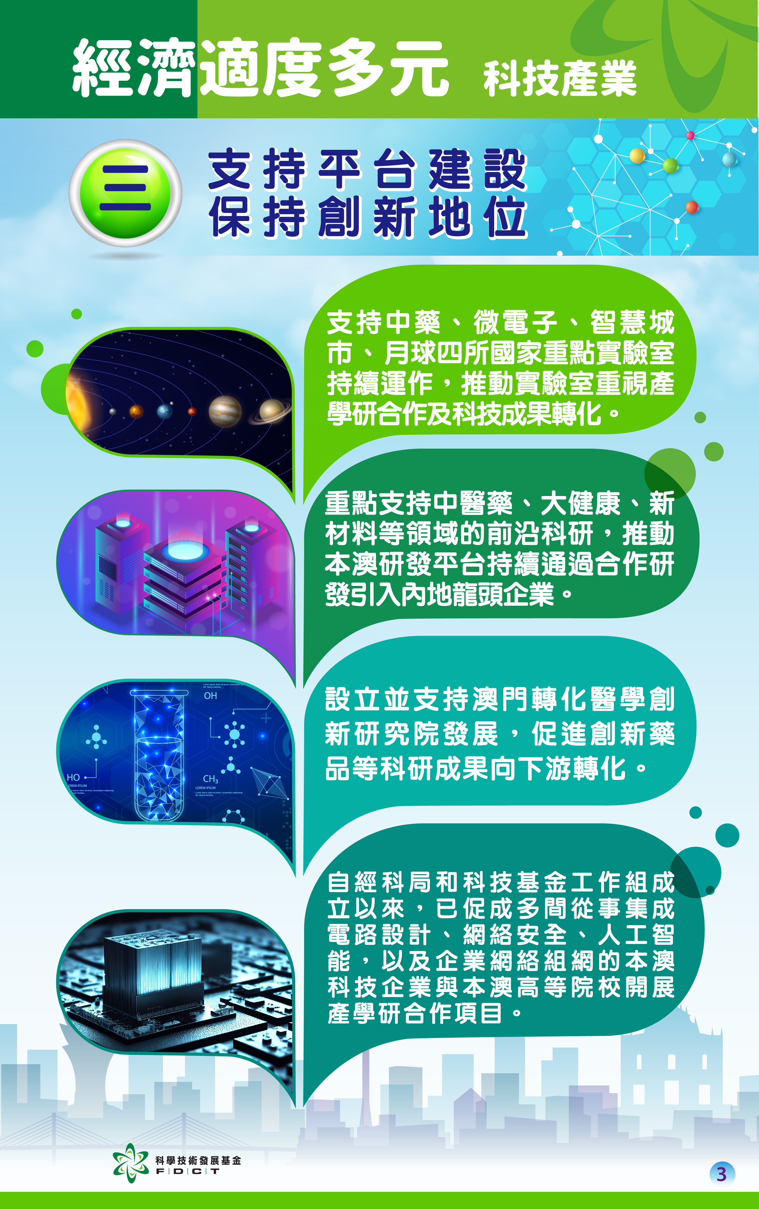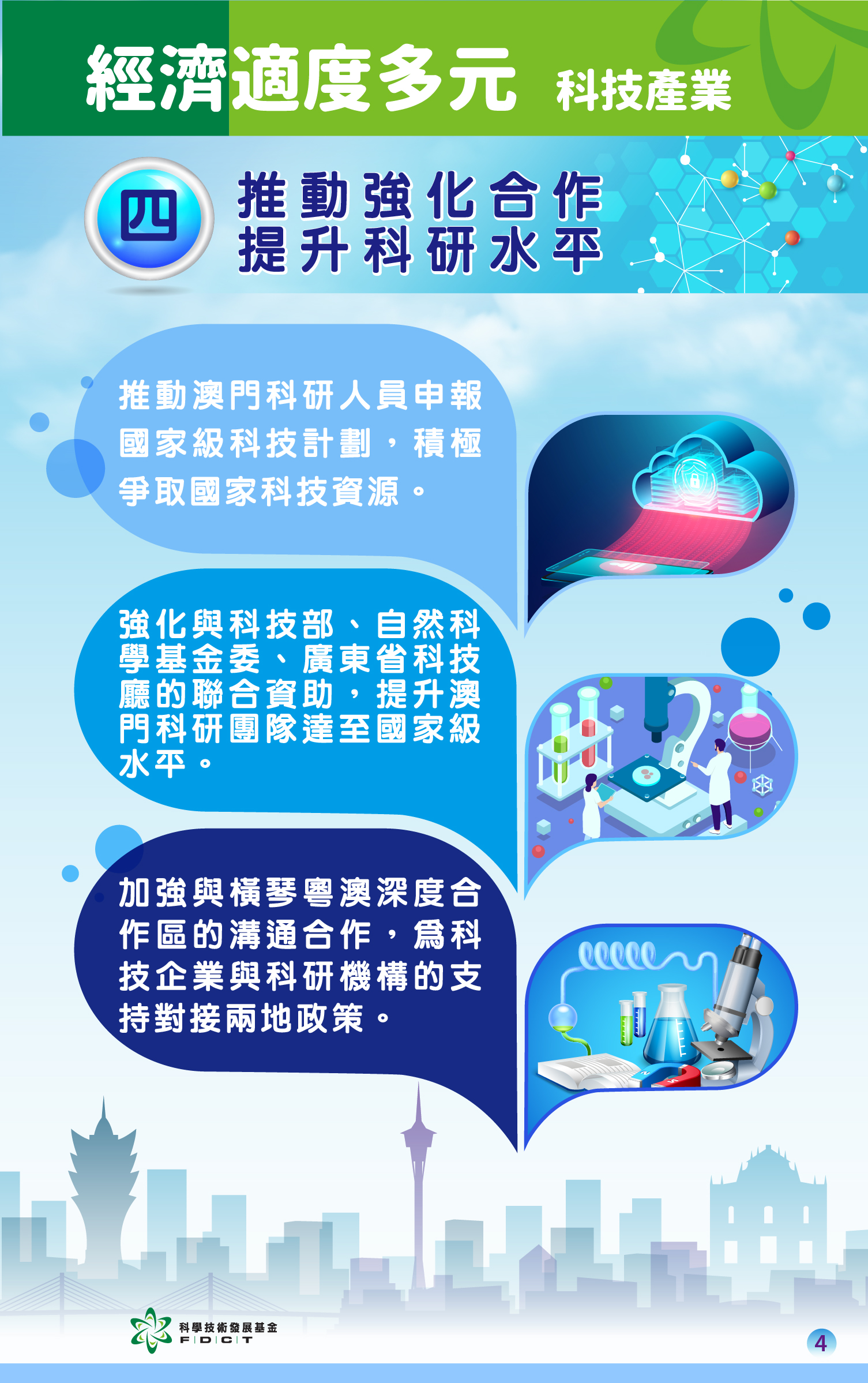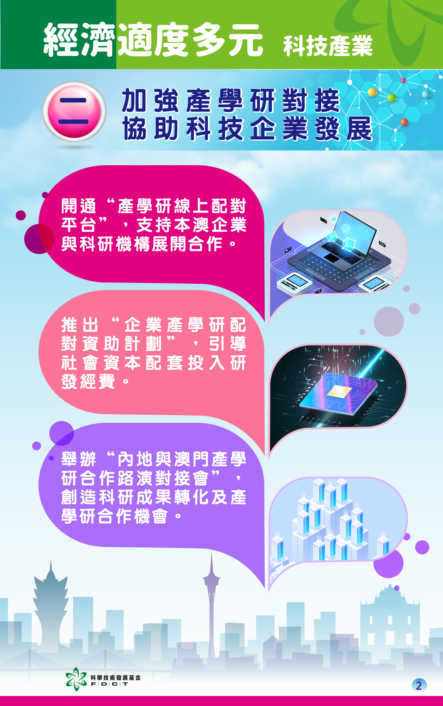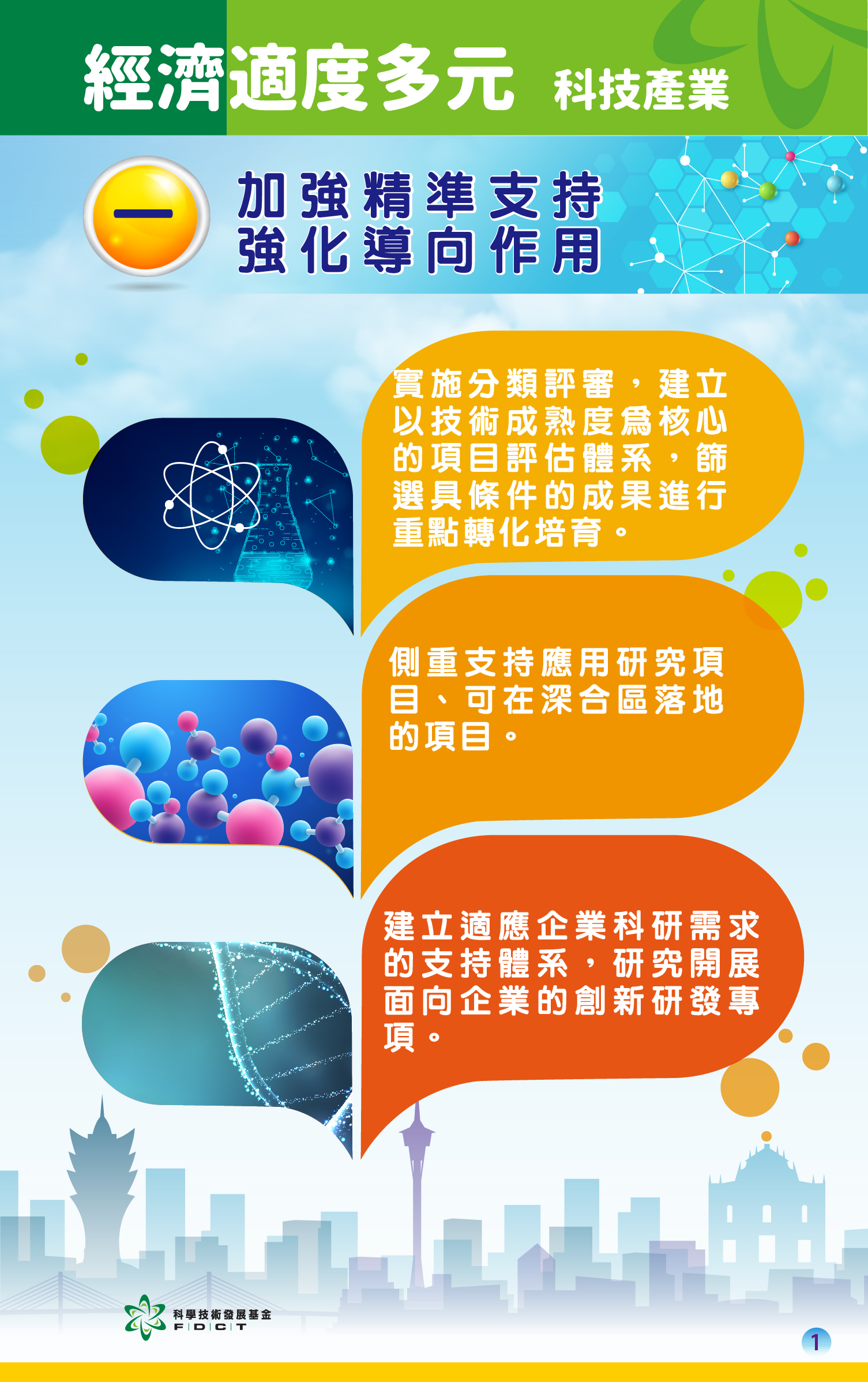 為促進科技產業發展,以推動經濟適度多元,經濟及科技發展局與科學技術發展基金緊密合作,從多維度優化產學研合作生態,促進建立成果轉化模式。