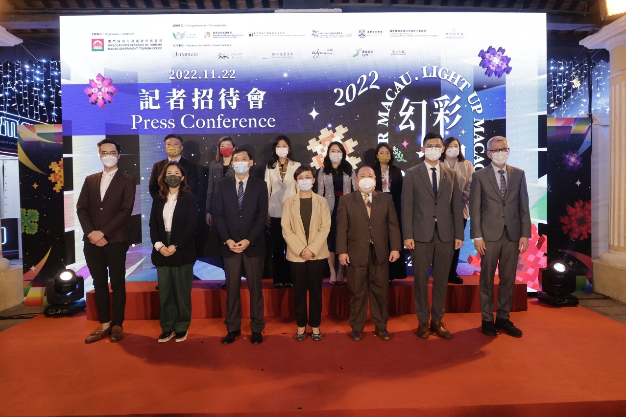旅遊局今(22日)在氹仔嘉模墟舉行記者招待會介紹“2022幻彩耀濠江”。旅遊局局長文綺華及副局長許耀明、體育局體育設施管理廳廳長何華、文化局演藝發展廳代廳長黃穎緹、經濟及科技發展局科技應用及支援處處長陳祖榮、海事及水務局宣傳推廣處處長吳鎮庭、澳門科學館副館長張雄發,以及合作單位 — 6家綜合旅遊休閒企業代表等出席。