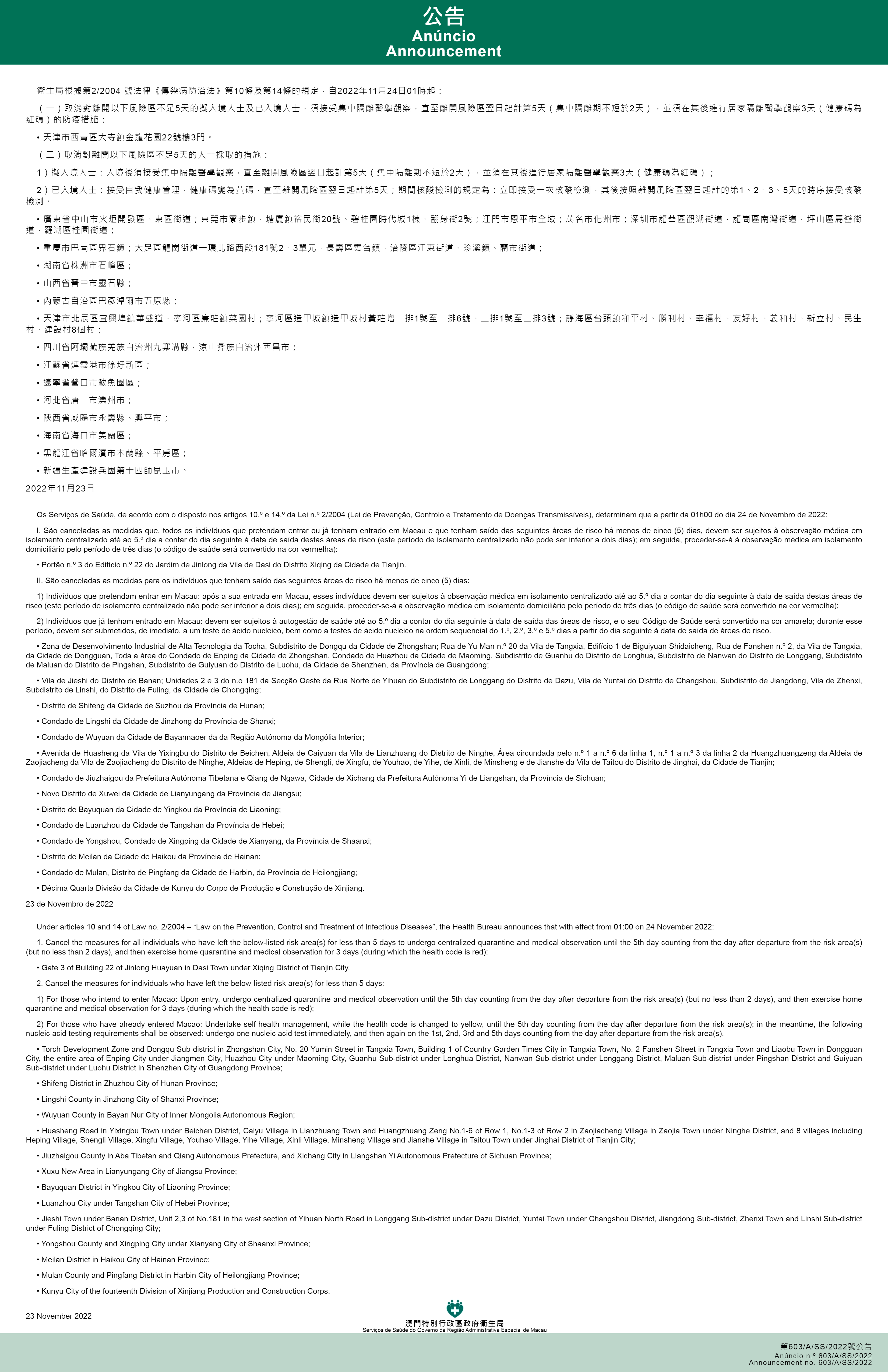 新型冠狀病毒感染應變協調中心(下稱應變協調中心)宣佈,因應內地的疫情變化,衛生局根據第2/2004號法律《傳染病防治法》第10條和第14條的規定,自2022年11月24日凌晨1時起,新增或取消對曾到內地相關區域人士的防疫措施: