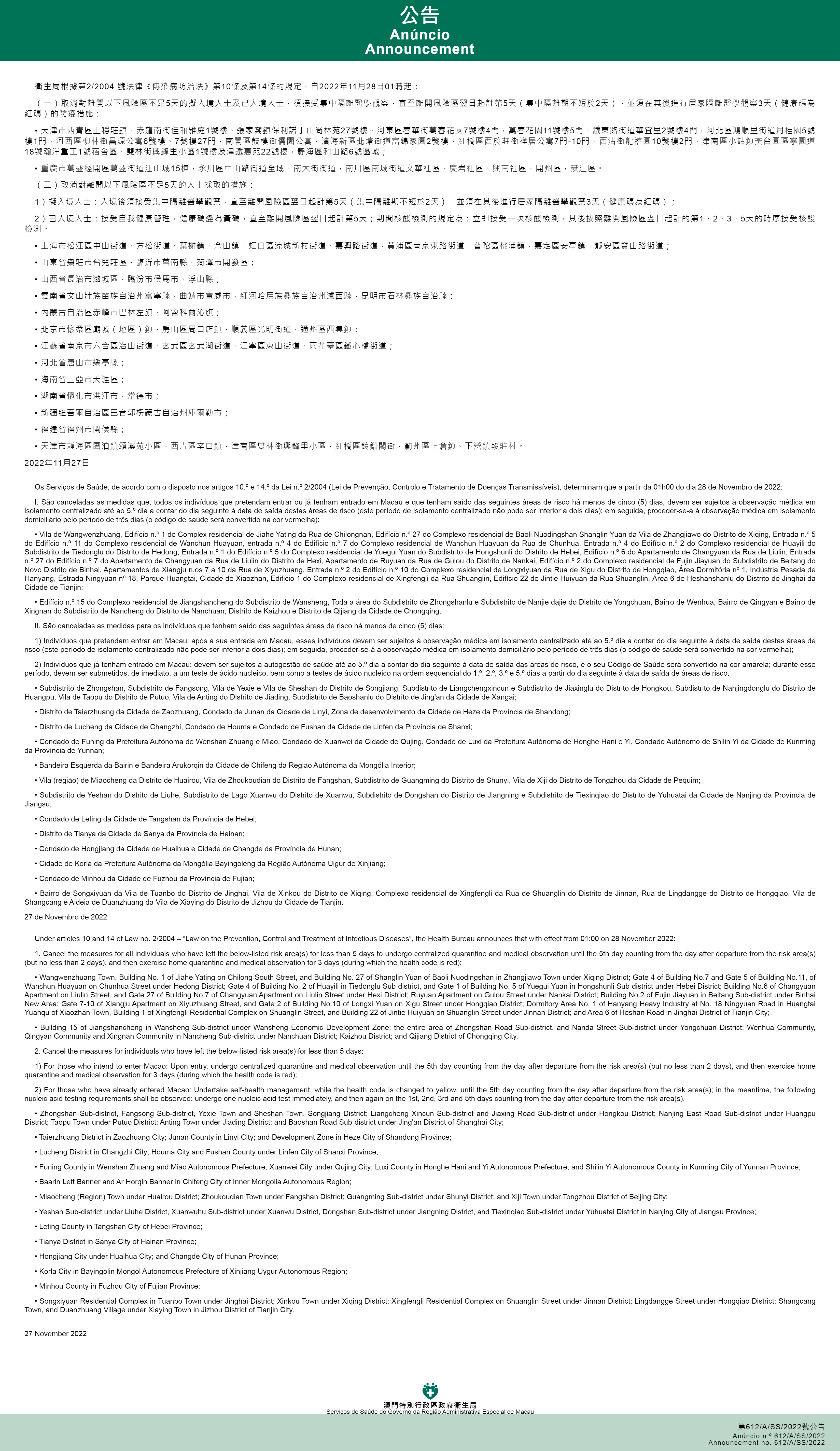 新型冠狀病毒感染應變協調中心(下稱應變協調中心)宣佈,因應內地的疫情變化,衛生局根據第2/2004號法律《傳染病防治法》第10條和第14條的規定,自2022年11月28日淩晨1時起,新增或取消對曾到內地相關區域人士的防疫措施: