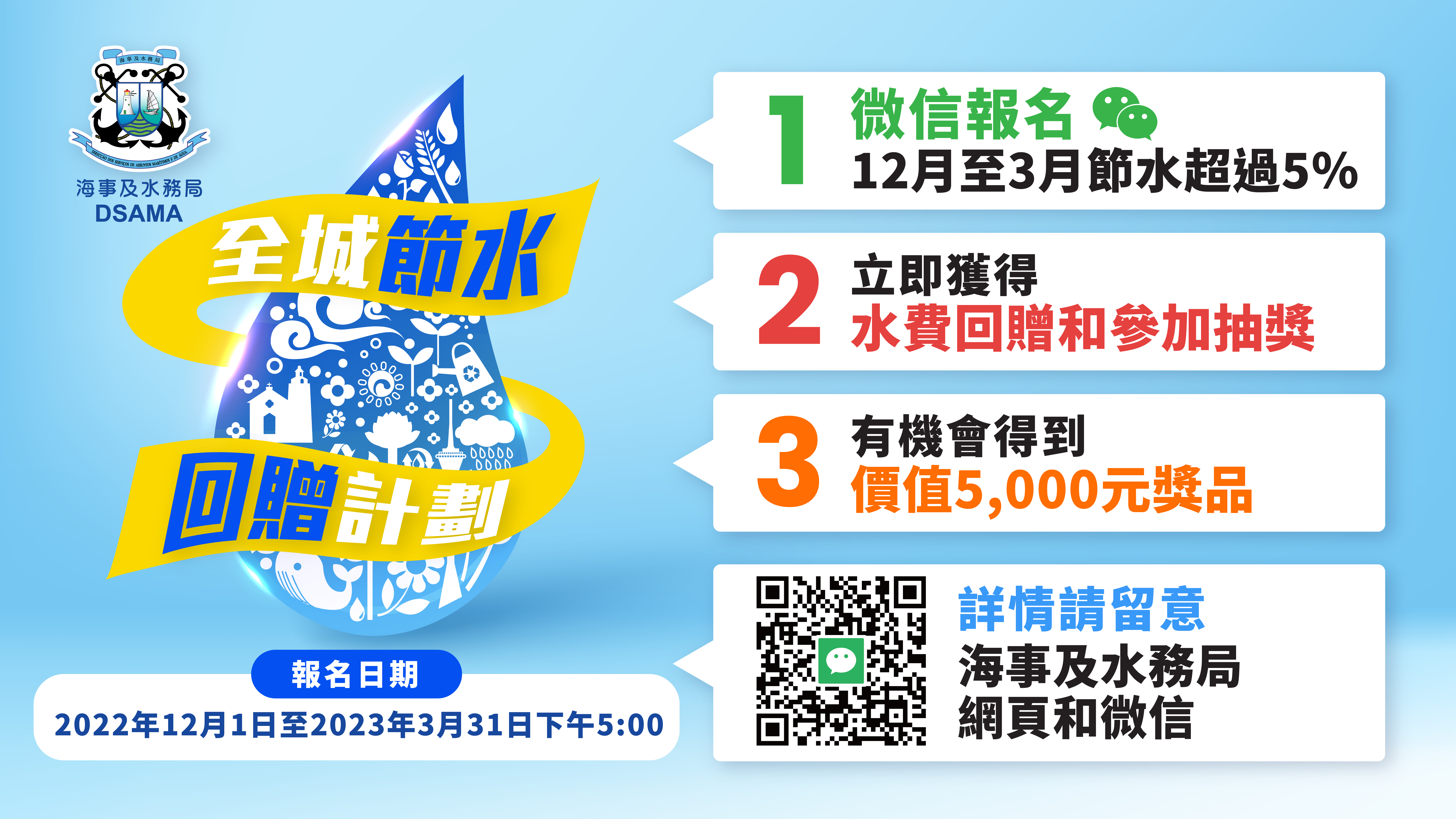 為推動全澳家庭及各行各業積極節約用水應對鹹潮威脅,海事及水務局再度推出全城節水回贈計劃鼓勵居民節約用水,自來水用戶只要報名並達到節水目標,除了可獲水費回贈,還可自動參與抽獎,獎品豐富。活動由即日起接受報名至3月底。