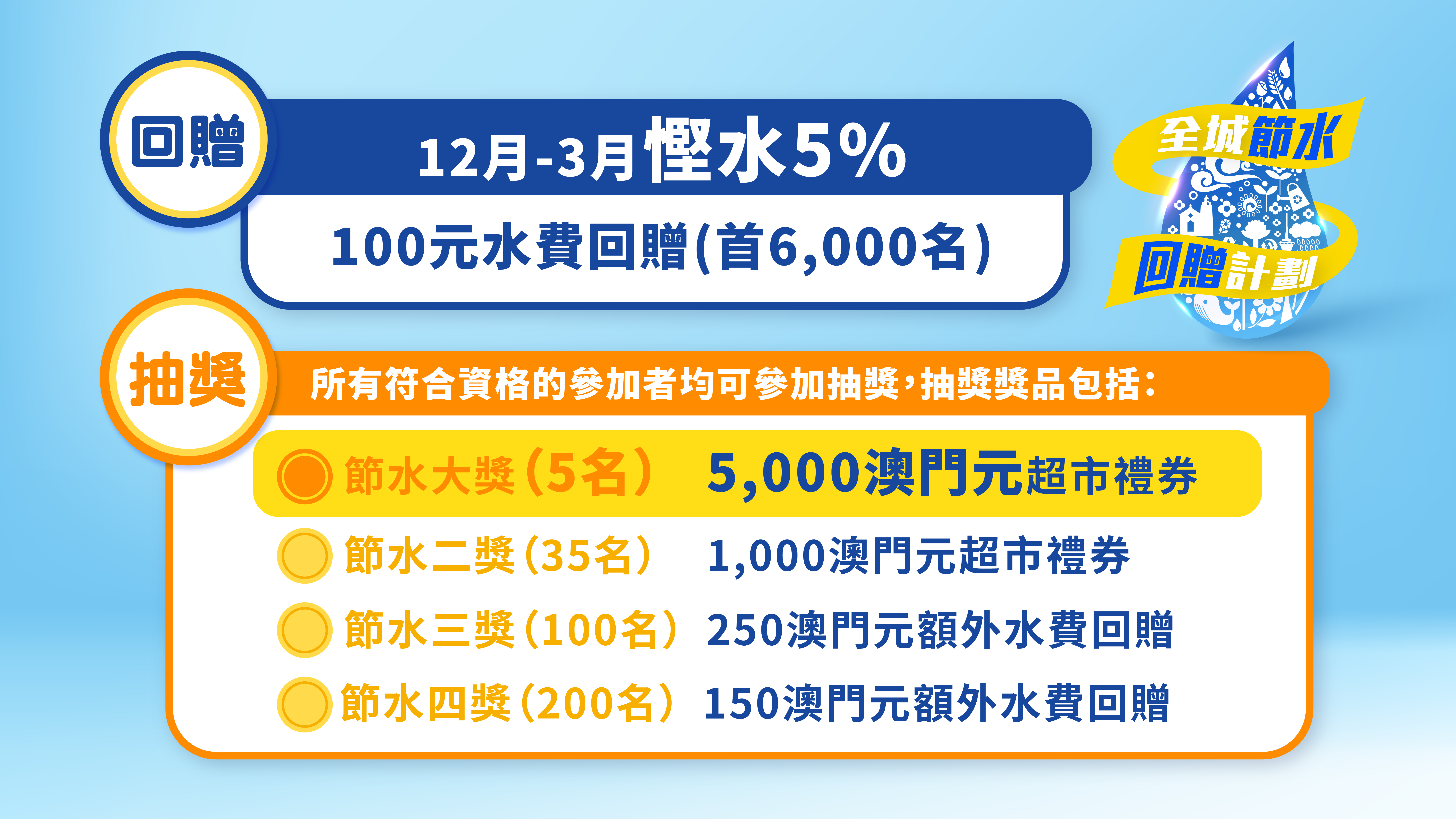 報名參加的首6,000戶,於2022年12月至2023年3月期間,用水量較去年同期節約5%至30%,即可獲得100元的水費回贈,同時自動參加抽獎,有機會獲得最多5,000元的超市禮券,抽獎獎品超過300份,報名期至2023年3月31日下午5時。