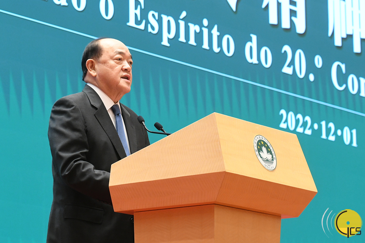 行政長官在宣講會上致辭時表示,榮幸請到中央宣講團成員來澳宣講二十大精神,希望與會人士認真聆聽和領會。他指出,學習宣傳貫徹二十大精神是當前和今後一個時期全國的首要政治任務,澳門各界必須認真學習和全面準確領會二十大精神,並且應當着重把握以下五個方面: