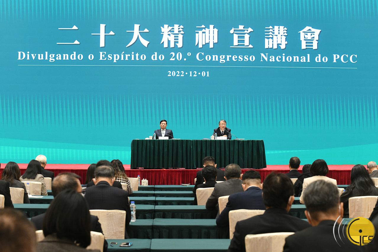 “二十大精神宣講會”分上、下午兩場,在中國與葡語國家商貿合作服務平台綜合體舉行,由中央宣講團成員、全國人大常委會法制工作委員會主任沈春耀,中央宣講團成員、全國政協經濟委員會副主任謝伏瞻向與會人士進行宣講。