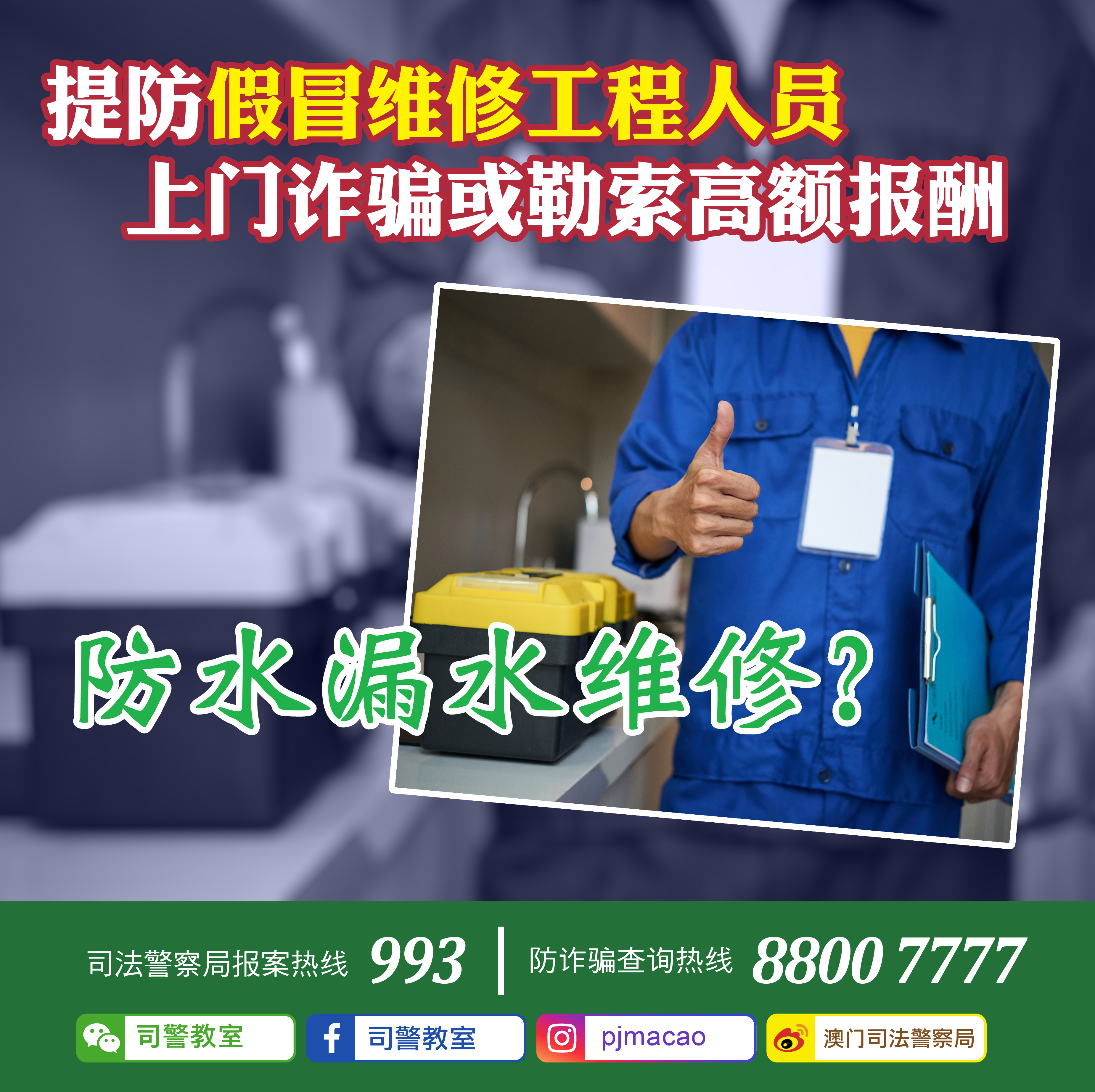 司警局近日接獲多名市民舉報,指有人於網絡社交平台冒認工程公司人員,聲稱提供家居滲漏水檢查及維修服務。多名事主遂邀約上門檢查,同意報價並進行維修,然而完工後被索取高於報價金額數倍的費用。在對方威迫之下,事主最終就範支付,並於事後報警求助。