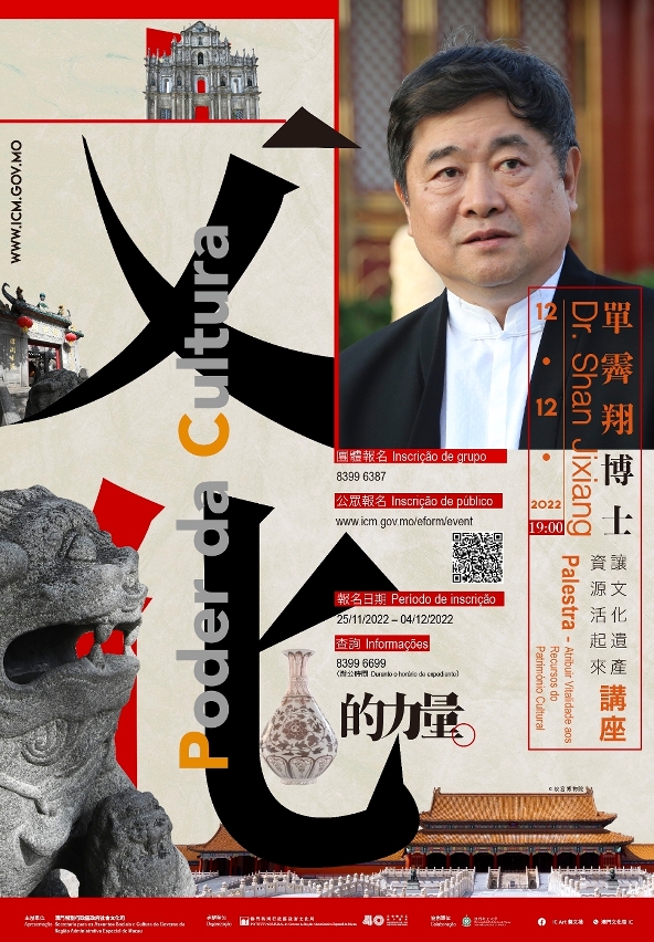 由澳門特別行政區政府社會文化司主辦、文化局承辦、澳門理工大學協辦的“文化的力量——讓文化遺產資源活起來”講座,將於下周一(12月12日)晚上7時假澳門理工大學體育館舉行。故宮博物院原院長單霽翔博士擔任主講嘉賓,介紹我國當前的世界文化遺產概況,分享故宮文化資源保護和開發經驗,探討如何借助技術手段和形式創新,把文化遺產資源真正融入人們的生活。
