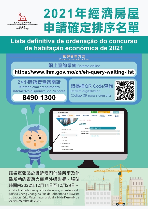 因應防疫安排,房屋局呼籲申請人善用網上查詢系統(https://www.ihm.gov.mo/zh/eh-query-waiting-list)、微信及24小時語音電話(8490 1300)查詢申請情況。而選擇現場查閱名單之人士,必須佩戴口罩及出示個人健康碼。