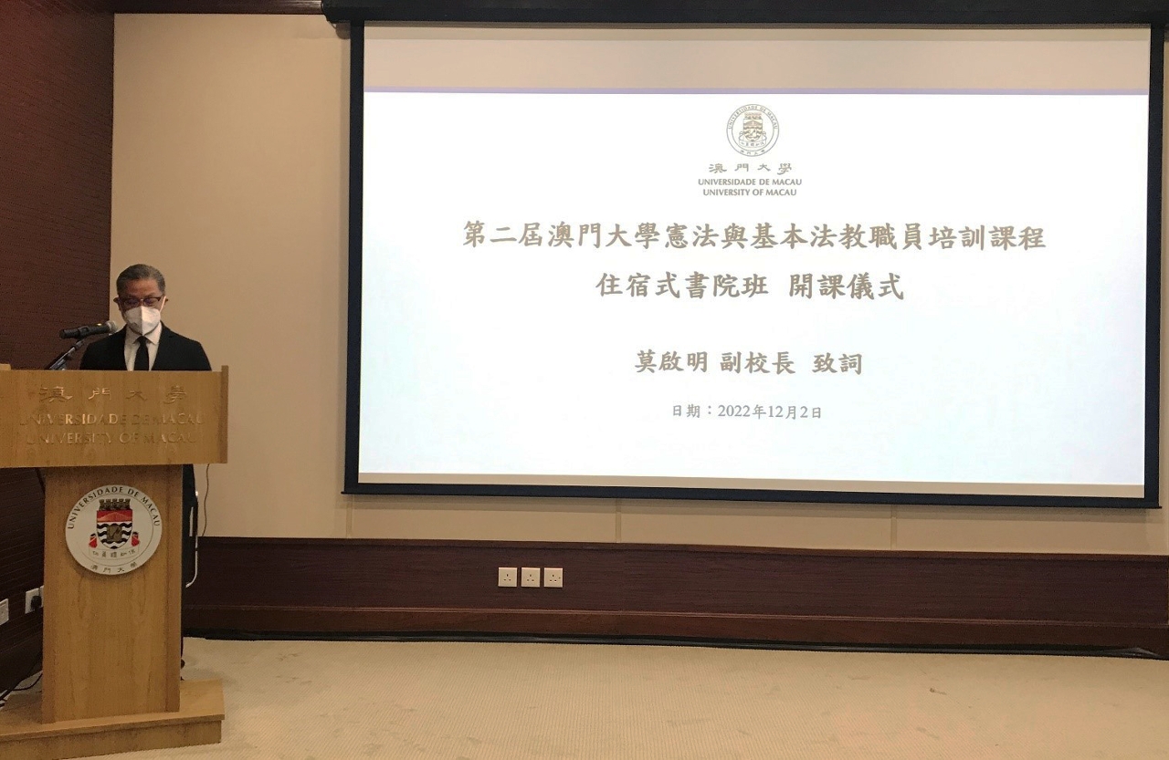 澳大副校長莫啓明致辭時表示,澳大高度重視培養學生愛國愛澳的品格和家國情懷,而憲法與基本法課程是推動愛國愛澳教育工作的重要環節。為善用澳大書院的優勢,打造學生良好和便利的兩法教育環境,澳大就10間書院學術人員開辦“住宿式書院班”課程。該課程根據澳門特別行政區政府教育及青年發展局的《澳門高校憲法與基本法課程(非法律專業)教學示範大綱》的內容、法學院憲法與基本法研究中心研發《澳門大學憲法與基本法系統化教學方案》過去4年累積的學習數據和前期針對澳門中小學開展國家安全教育研究所指出的弱環節、以及書院開展兩法教育的需求,設計5堂合計10個小時的兩法證書課程,讓書院學術和行政人員對兩法教育有更全面的理解,有助書院在兩法教育上發揮應有的功能。
