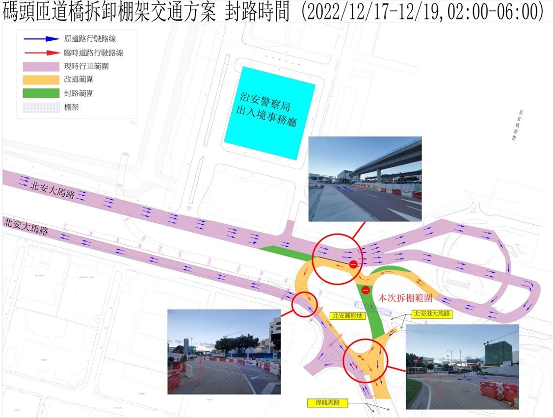 為配合澳氹第四條跨海大橋起止點周邊路網建造工程 – 偉龍馬路連接線拆棚工作,2022年12月17日至19日每日凌晨2時至清晨6時,北安圓形地一帶需作交通改道及有限度通車,請駕駛者留意現場交通指示。