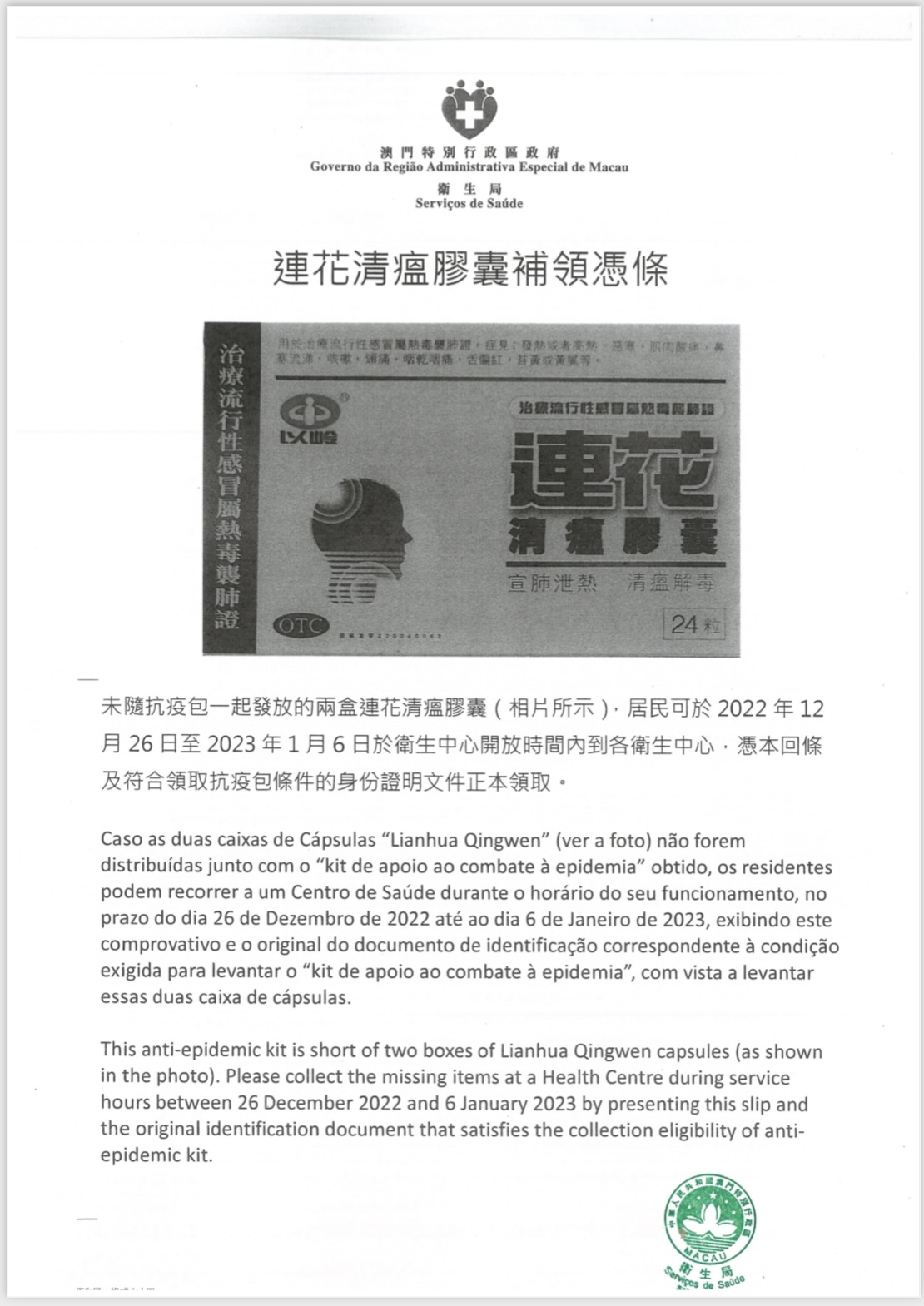 新型冠狀病毒感染應變協調中心表示,抗疫包的派發工作已經進入最後一天。本澳已經順利採購150萬盒連花清瘟膠囊,並分批抵達澳門,但由於內地疫情關係及部份藥品在內地運送過程中被壓壞,影響部份連花清瘟膠囊運抵本澳時間,因此,今(18)日部分抗疫包將附有蓋有衛生局印章的“連花清瘟膠囊補領憑條”(憑條式樣請參閱附圖),獲發憑條的人士可在2022年12月26日至2023年1月6日於衛生中心開放時間內到衛生中心,出示憑條正本及符合領取抗疫包條件的身份證明文件正本,補領兩盒連花清瘟膠囊。憑條不可轉讓。不便之處,敬請諒解。