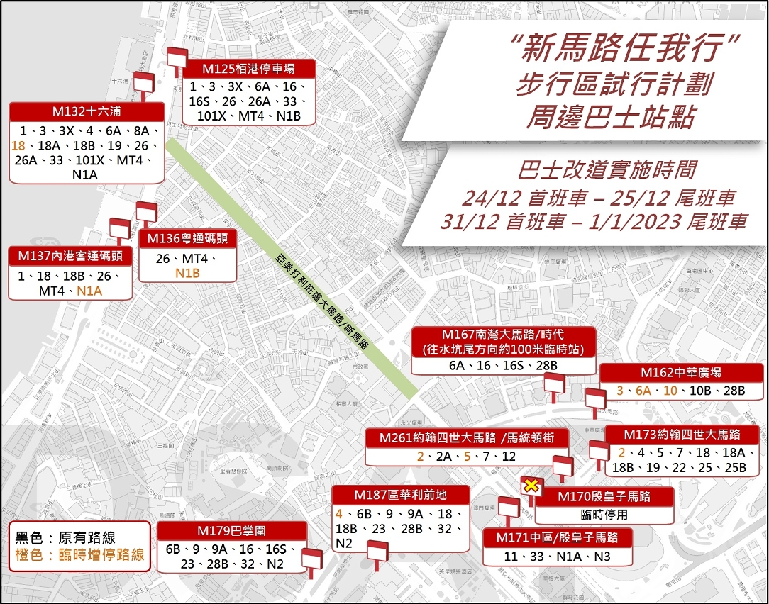 配合文化局於12月24日、25日、31日及明年1月1日舉辦的“新馬路任我行”步行區試行計劃,12月24日上午8時至25日晚上11時59分,以及12月31日上午8時至2023年1月1日晚上11時59分,介乎巴素打爾古街與龍嵩正街之間的一段新馬路(亞美打利庇盧大馬路)及周邊部份道路實施封閉交通,部份路段則設為允許特許車輛通行路段,以方便公共及緊急服務車輛維持服務(詳見附表)。而為保障車輛進出新馬路東西兩則道路,快艇頭街、果欄街、關前後街及介乎新填巷與紅窗門街之間一段福隆新街將實施反方向行車。