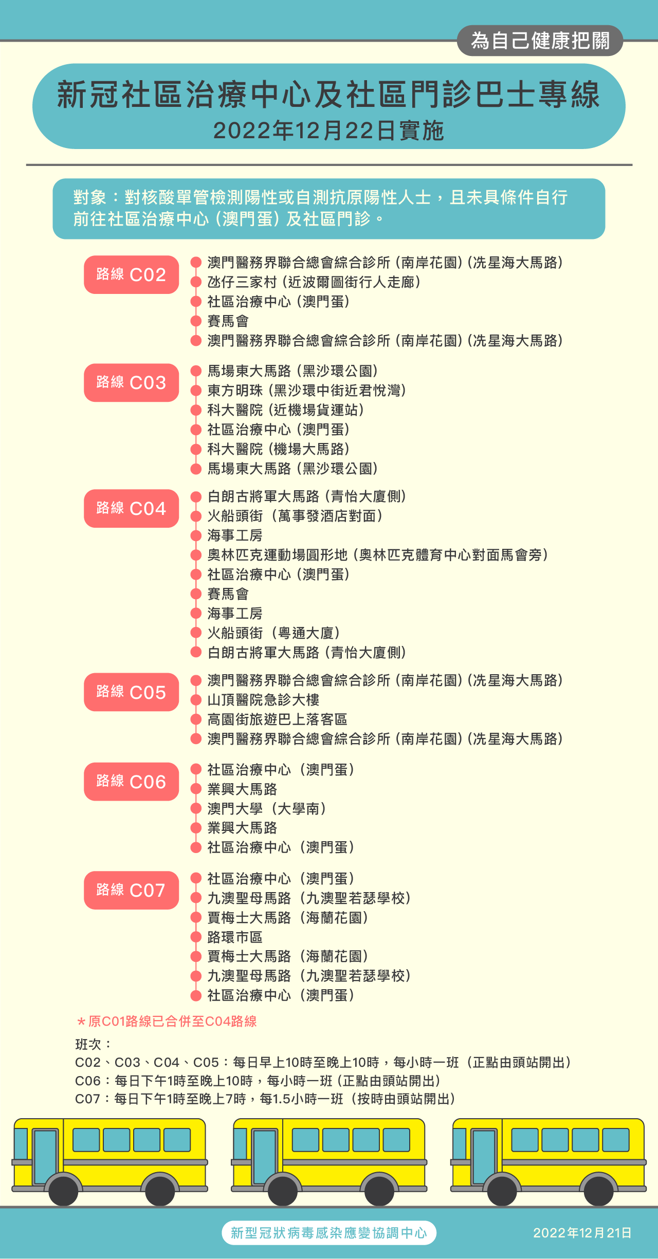 新型冠狀病毒感染應變協調中心表示,由12月22日(星期四)起,將對C04及C06新冠社區治療中心及社區門診巴士專線路線作調整,C04線新增位於火船頭街粵通大廈及萬事發酒店對面的站點,C06線調整由澳門蛋開出經石排灣社區往返澳門大學,以方便對核酸單管檢測陽性或自測抗原陽性人士,且未具條件自行前往社區治療中心(澳門蛋)及社區門診就診。市民在出發到社區門診前,請留意相關地點及服務安排 (一般營運時間為早上10時至晚上7時),詳請可參見https://app.ssm.gov.mo/coutpatstation/map 。