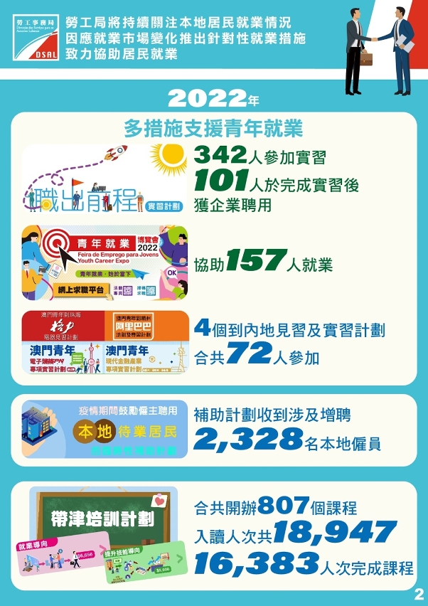 勞工事務局2022年積極開展不同的職業配對活動,結合推出各類就業支援措施,全力協助及促進本地居民投入勞動市場。