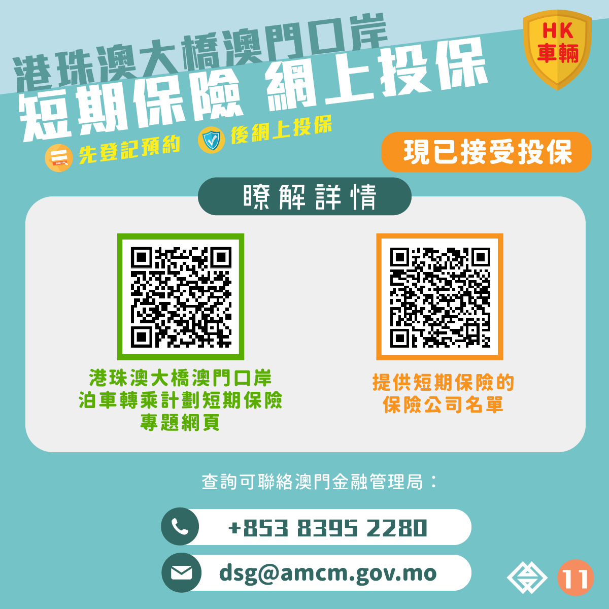 為便利香港旅客自駕來澳,澳門金融管理局協調澳門保險業界推出“港珠澳大橋澳門口岸泊車轉乘計劃短期保險”(下稱“短期保險”),讓香港車主可透過網上平台購買短期保險後,將車輛停泊於港珠澳大橋澳門口岸東停車場。