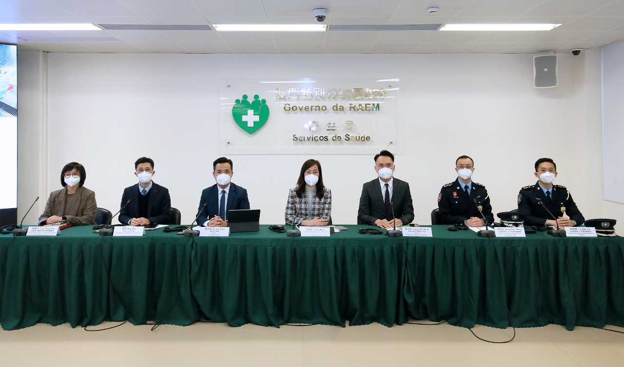 新型冠狀病毒感染應變協調中心1月5日舉行記者會,社會文化司歐陽瑜司長、衛生局羅奕龍局長、教育及青年發展局龔志明局長、社會工作局韓衛局長、旅遊局傳播及對外關係廳劉鳳池廳長、治安警察局出入境管制廳黃劍虹廳長及公共關係處李德輝處長分別介紹了本澳的整體防疫情況。
