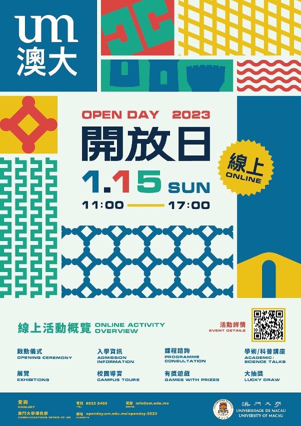 澳門大學開放日2023將於1月15日(星期日)在線上舉行,讓澳門和海內外的學生、家長和朋友隨時隨地都可“暢遊”澳大校園,了解大學最新的入學資訊、教學特色、研究成果等。歡迎有興趣人士於當天上午11時起登入澳大開放日網頁參與。