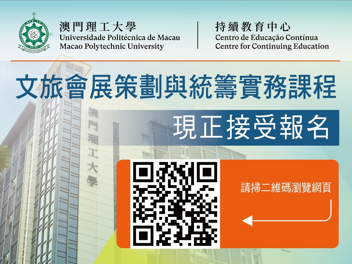 澳理大持續教育中心去年開辦“文旅會展策劃與統籌實務”課程,深受學員歡迎,近期將再次開辦。課程內容包括認識會展分類,設計會展概念,會展計劃的策劃、統籌和評估,資訊科技應用,執行會展計劃過程中的物流管理、預算監控、風險管理等,將由資深會展業界人士任教,分享實際從業經驗和個案研討,並探討國際會展業未來趨勢。