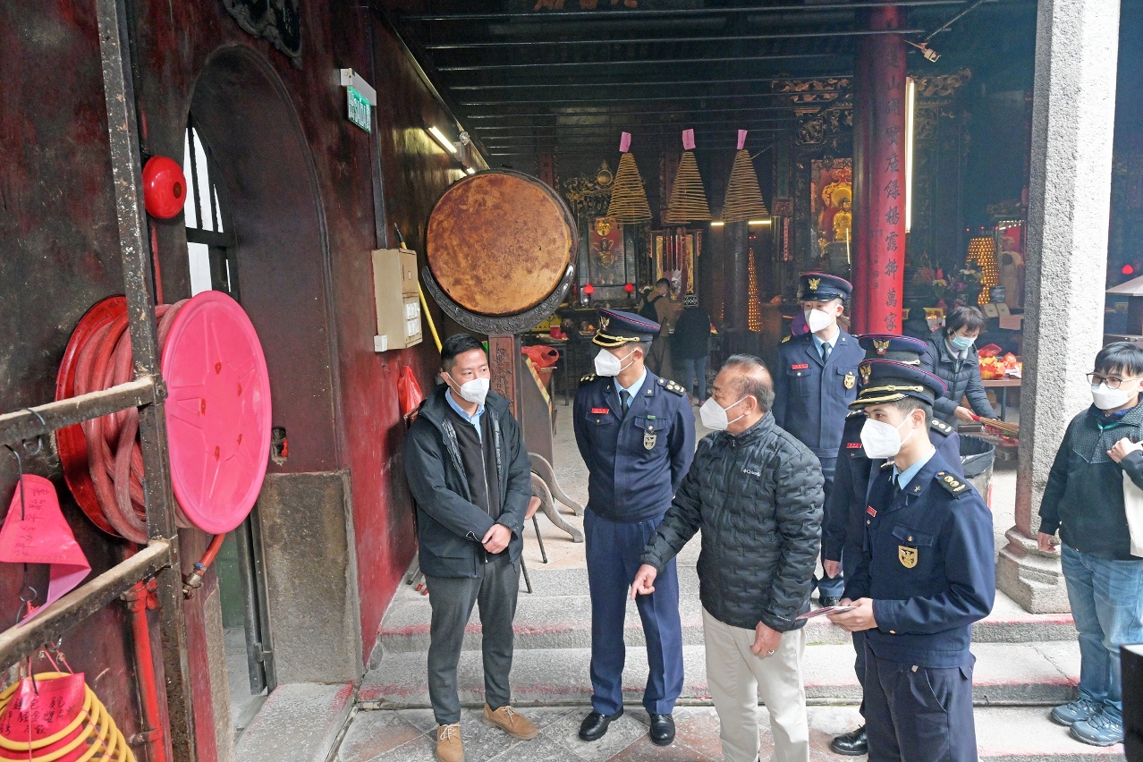 春節將至,為保障廟宇在節日期間的消防安全,繼日前與廟宇管理者召開“廟宇消防管理工作會議”後,文化局聯同消防局一連三日(1月17至19日)排查全澳各所廟宇,重點檢查用電設備安全,並實地與管理者溝通,落實廟宇在節日期間的防火安全管理及人流應對安排。