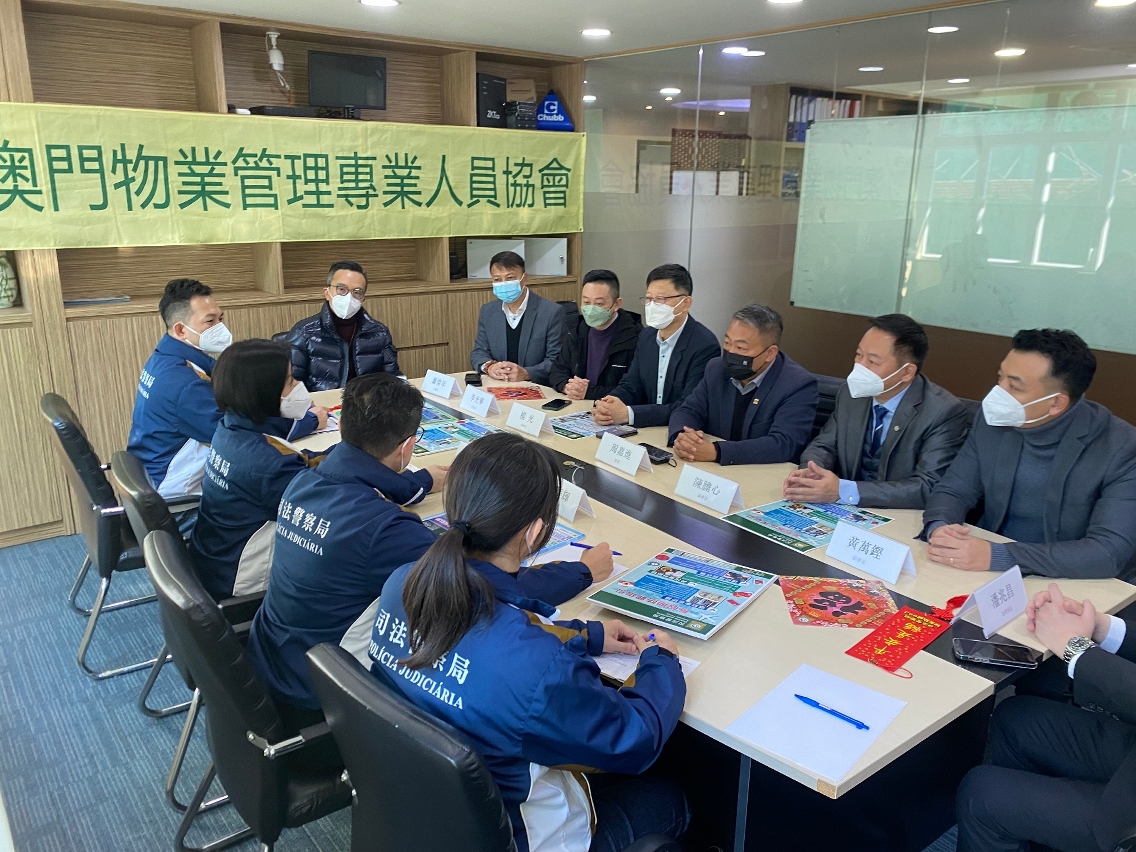 1月9日至18日期間,司警局人員先後與來自澳門街坊會聯合總會、澳門工會聯合總會、澳門婦女聯合總會、澳門歸僑總會、民眾建澳聯盟、澳門物業管理業商會、澳門不動產管理專業技術人員協會及澳門物業管理專業人員協會等社團的“司警局大廈防罪之友"會員舉行會議,就社區最新治安狀況、加強警民合作做好冬防工作等方面交流意見。