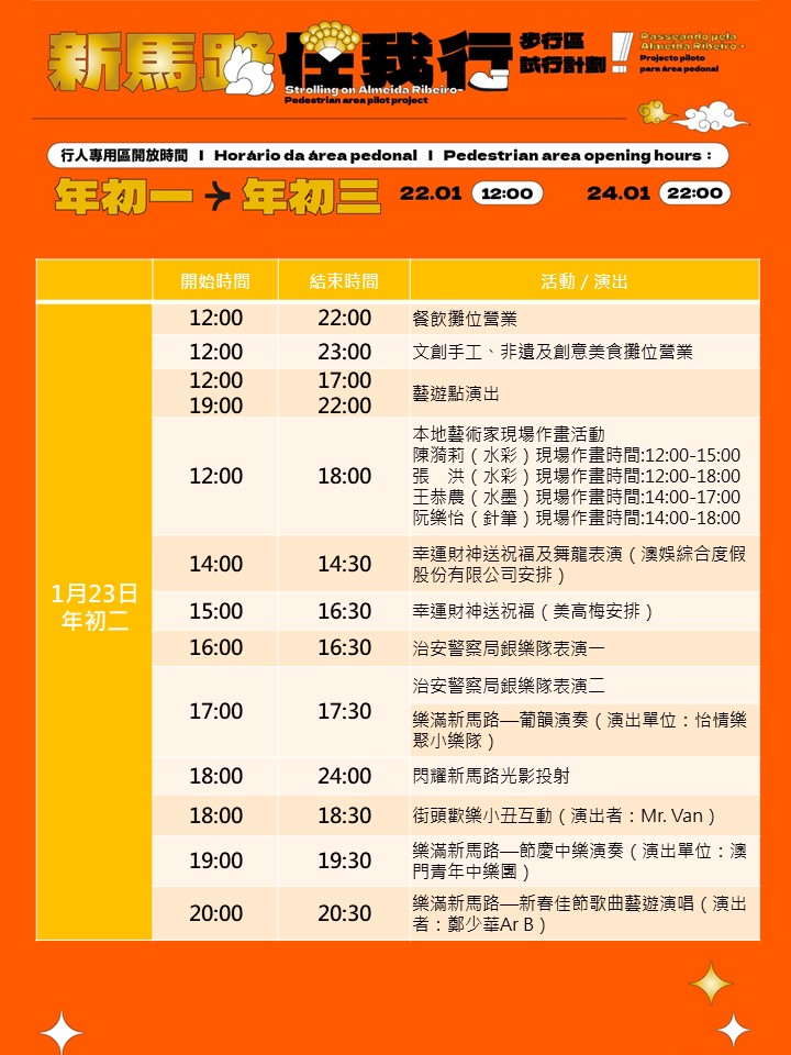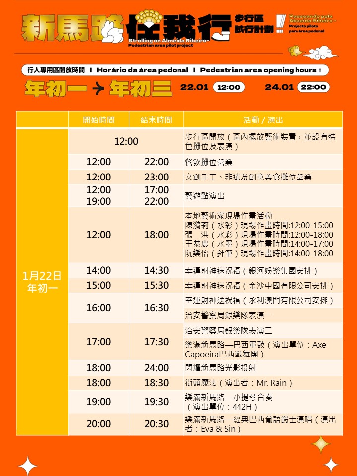 由文化局、交通事務局、旅遊局、治安警察局、市政署、消防局等多個部門聯合舉辦,六大旅遊綜合體包括澳娛綜合度假股份有限公司、銀河娛樂集團、新濠博亞娛樂有限公司、美高梅、金沙中國有限公司及永利澳門有限公司共同支持打造的嶄新城市項目“新馬路任我行——步行區試行計劃”,將於大年初一(1月22日)起舉行,新馬路將化身“城市森林”,設有多項藝術裝置、特色攤位及精彩演出,匯聚創意和藝文動能,激活傳統街區,為遊人提供新奇別致的文化旅遊步行體驗,透過連串精彩活動,與市民旅客歡度新春、共慶佳節。