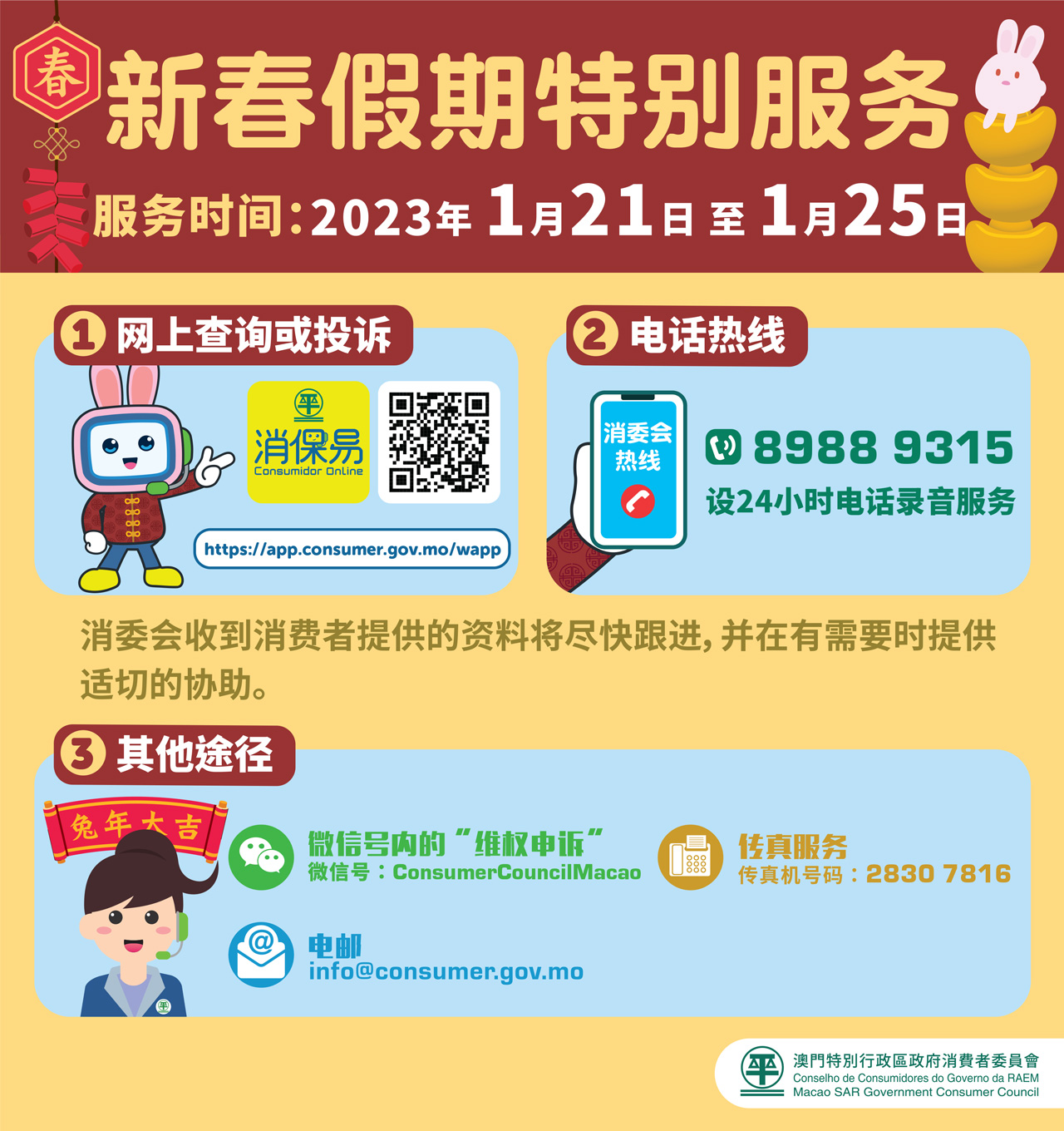消委會微信號(ConsumerCouncilMacao)內的“維權申訴”、電郵(info@consumer.gov.mo)以及傳真服務(傳真號碼:28307816)亦接受消費者的查詢或投訴,消委會將適時作出跟進。