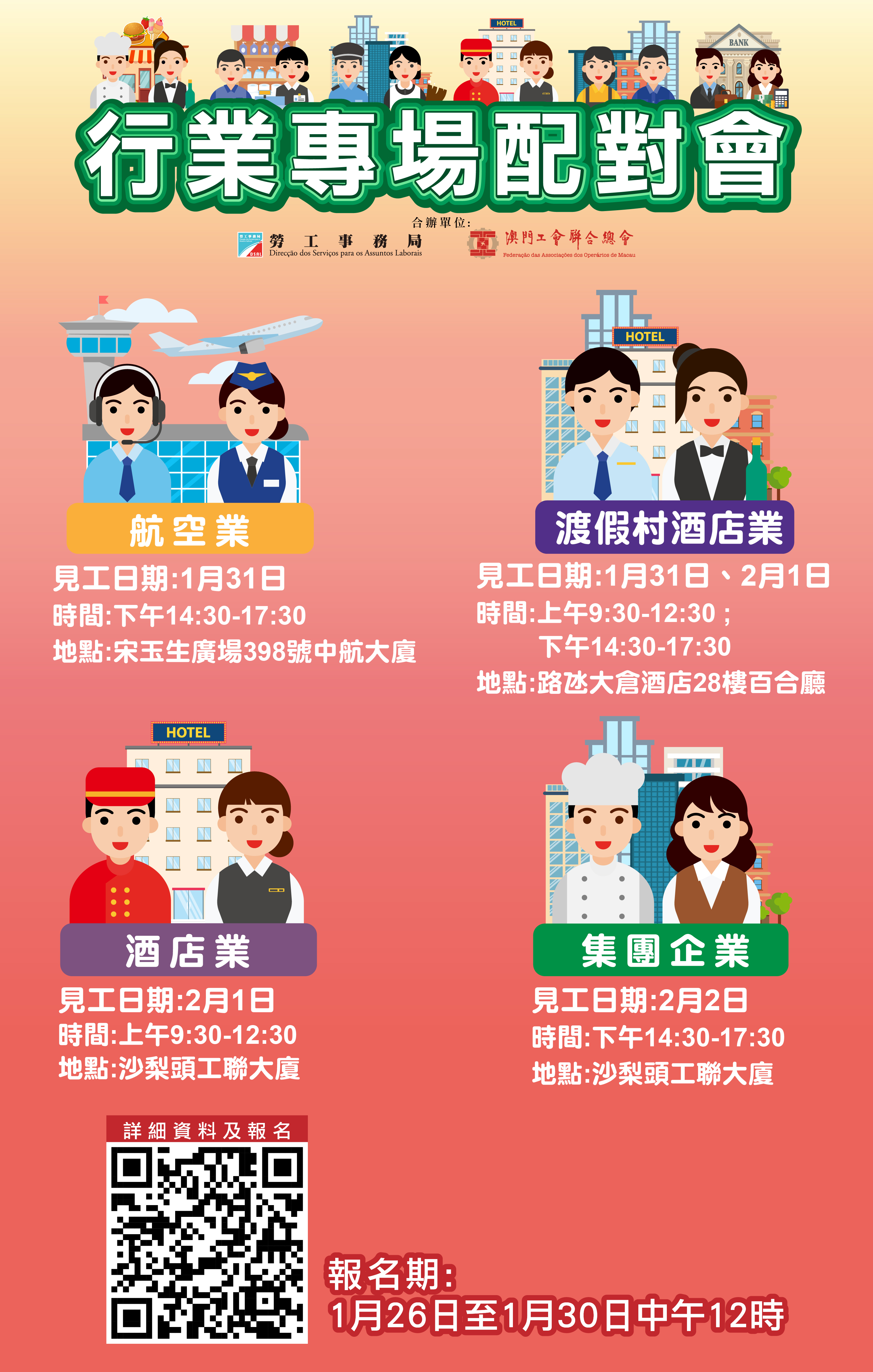 勞工局和工聯會透過短訊通知欲尋找相關工作的求職者,凡收到短訊的求職者或有意參加配對會的澳門居民,可由1月26日起至30日中午12時,登入勞工局行業專場配對會專頁( https://www.dsal.gov.mo/zh_tw/standard/indjobfair.html )報名,名額有限,額滿即止。