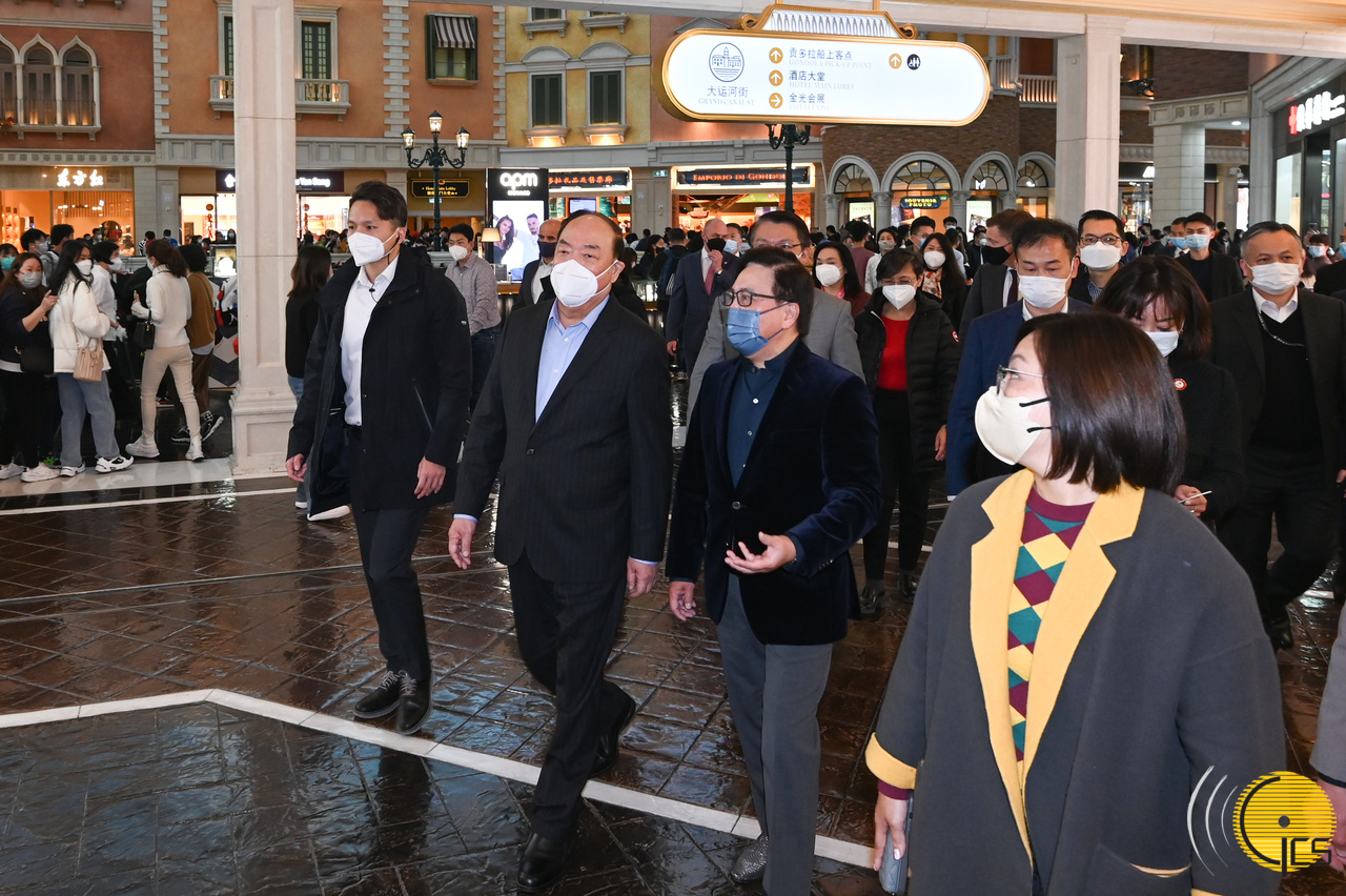 在經濟財政司司長李偉農、行政長官辦公室主任許麗芳、經濟財政司司長辦公室主任辜美玲、旅遊局局長文綺華、博彩監察協調局局長何浩瀚,以及澳門貿易投資促進局代主席余雨生陪同下,行政長官伉儷下午先後到訪美獅美高梅、新濠天地、永利皇宮、澳門上葡京、澳門威尼斯人以及澳門銀河等各企業的休閒設施。