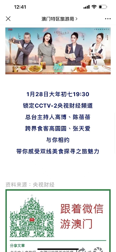 由特區政府與中央廣播電視總台聯合打造的大型美食文旅真人秀節目——《澳門雙行線——美食文旅來打卡》定於本周六(1月28日)年初七晚上7點30分在CCTV-2央視財經頻道首播,“央視頻”及“央視財經”手機應用同步播出,帶領內地廣大觀眾感受澳門雙線美食之旅,助力提升澳門旅遊吸引力。