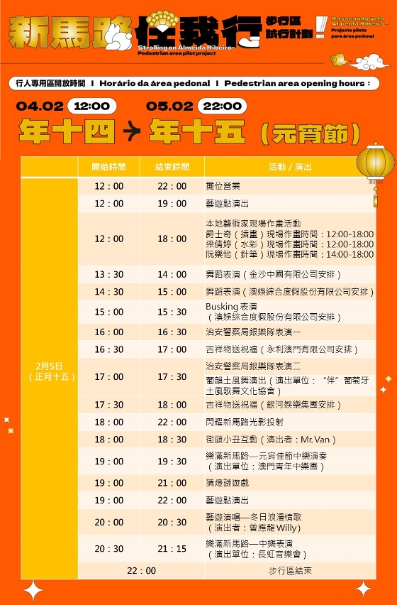 由文化局、交通事務局、旅遊局、治安警察局、市政署、消防局等多個部門聯合舉辦,六大綜合度假休閒企業包括澳娛綜合度假股份有限公司、銀河娛樂集團、新濠博亞娛樂有限公司、美高梅、金沙中國有限公司及永利澳門有限公司,以及澳門餐飲業聯合商會、澳門中區南區工商聯會、澳門美術協會與福隆區坊眾互助會共同支持打造的嶄新城市項目“新馬路任我行——步行區試行計劃”續於2月4日(正月十四)中午12時至2月5日(正月十五)晚上10時舉行,適逢元宵,本輪活動將帶來更多別開生面的現場裝置、特色攤位及應節演出等,傳承推廣中華傳統文化,與市民和旅客歡度佳節。