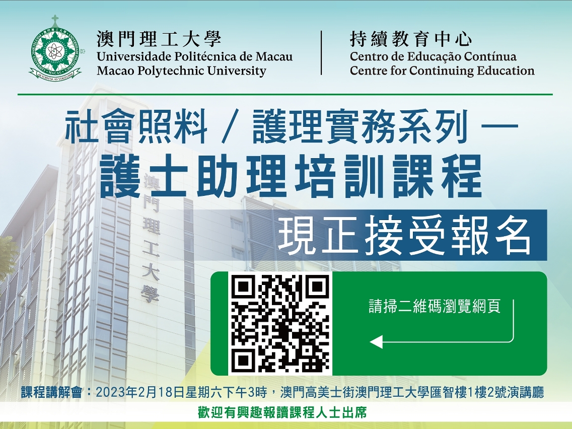 為配合特區政府社會文化司持續完善民生服務,提升居民生活素質施政方針,澳門醫療機構及院舍需要,培訓護士助理,提升照顧者的知識、技能和態度,以保障照顧服務素質,澳門理工大學持續教育中心開辦“護士助理培訓課程”,為有志投身醫療護理機構健康照顧工作的人士提供培訓。“護士助理培訓課程”由澳門理工大學健康科學及體育學院教學人員、臨床資深護士講授護理理論與實務,特區政府衛生局支持臨床實習。課程由即日起報名至2023年3月3日,並設有課程講解會。