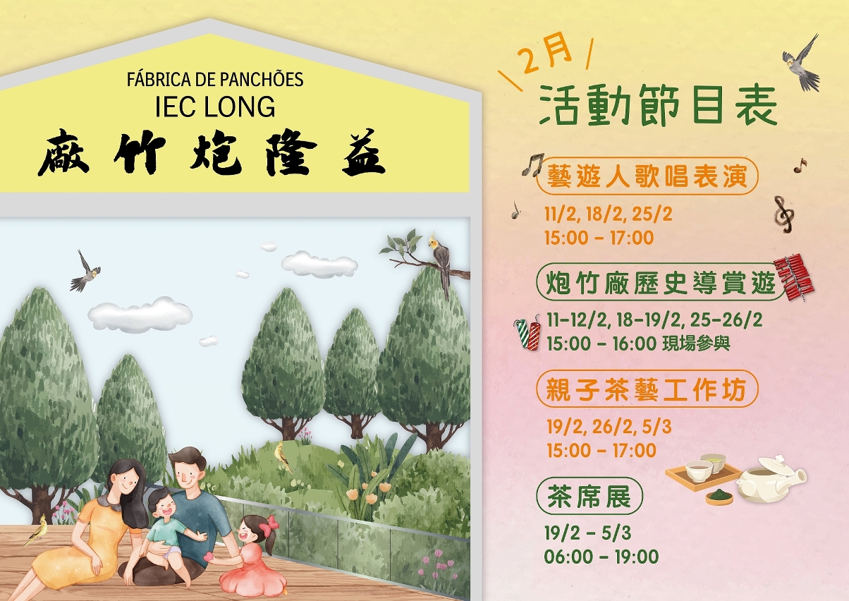 文化局將於2月期間逢周末在益隆炮竹廠舊址舉辦多項特色活動,包括藝遊人音樂表演、親子茶藝工作坊及炮竹廠歷史導賞遊等,持續豐富園區的體驗元素,讓市民旅客在綠意環抱的炮竹廠舊址,共度藝文相伴的悠然時光。