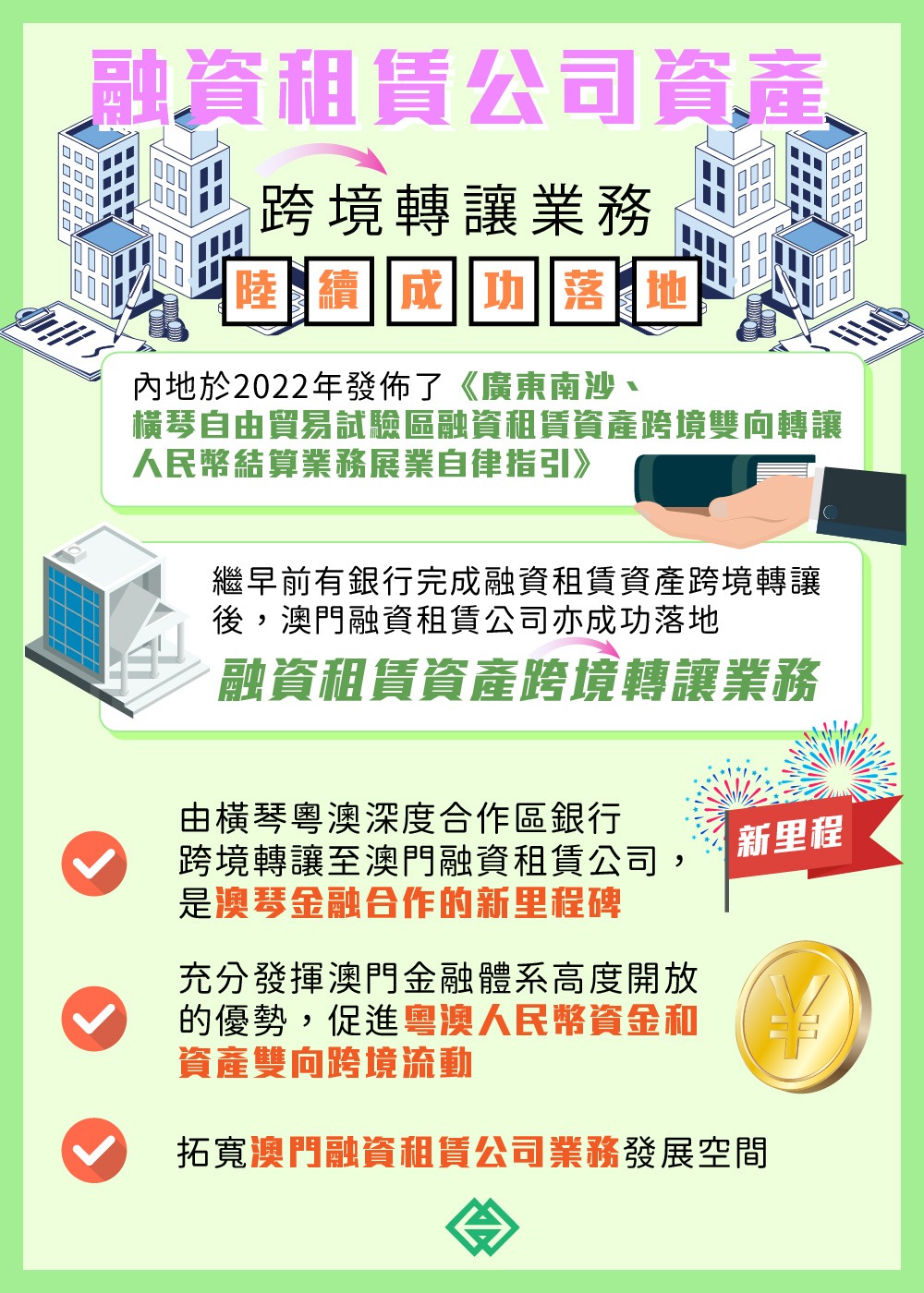 為促進及推動澳門現代金融業的發展,金管局與內地相關部委持續跟進溝通爭取支持。2022年4月,內地發佈《廣東南沙、橫琴自由貿易試驗區融資租賃資產跨境雙向轉讓人民幣結算業務展業自律指引》,允許廣東南沙和橫琴自貿區內銀行,與包括澳門在內的境外機構,跨境雙向轉讓融資租賃資產,並以人民幣進行跨境結算,助力擴大澳門融資租賃業務的規模。