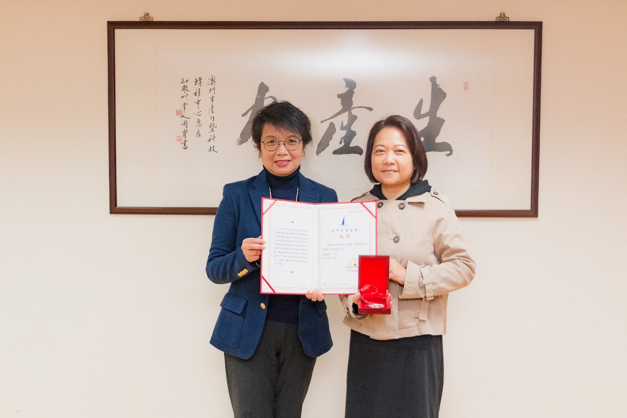 由於疫情原因,生產力促進獎頒獎典禮於去年12月15日在線上以直播形式舉行,再由生產力促進獎獎勵辦公室於典禮後將獲獎證書及獎牌郵寄獲獎者和單位。澳門生產力暨科技轉移中心理事長關治平昨日於總辦事處與李孟順教授會面,將收到的獲獎證書及獎牌親手交給她,祝賀她獲獎並讚揚她為提高青年學生的生產力而付出努力,獲獎是為澳增光。李孟順感謝中心將此國家重大獎項向本澳社會及大學推廣,對於從事推動生產力領域的專業人員具很大鼓舞。