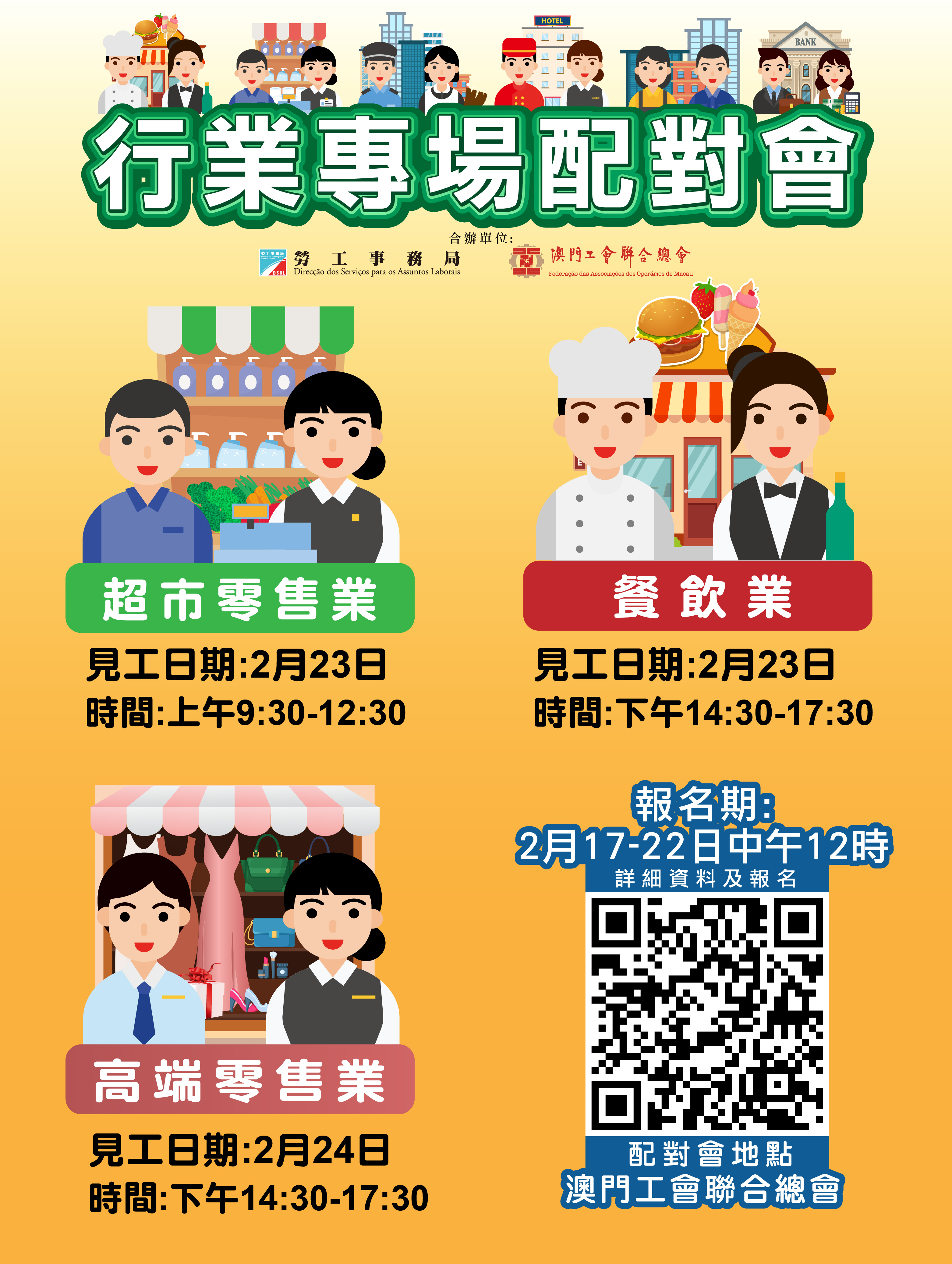 2月23日上午舉辦超巿零售配對會,提供205個職位空缺,涉及見習經理、店務組長、收銀員、理貨員、肉類處理員、網購專員、食品服務專員等。同日下午舉辦餐飲業配對會,提供26個職位空缺,涉及餐飲服務員、公關、樓面雜工、廚師、廚師助理等。