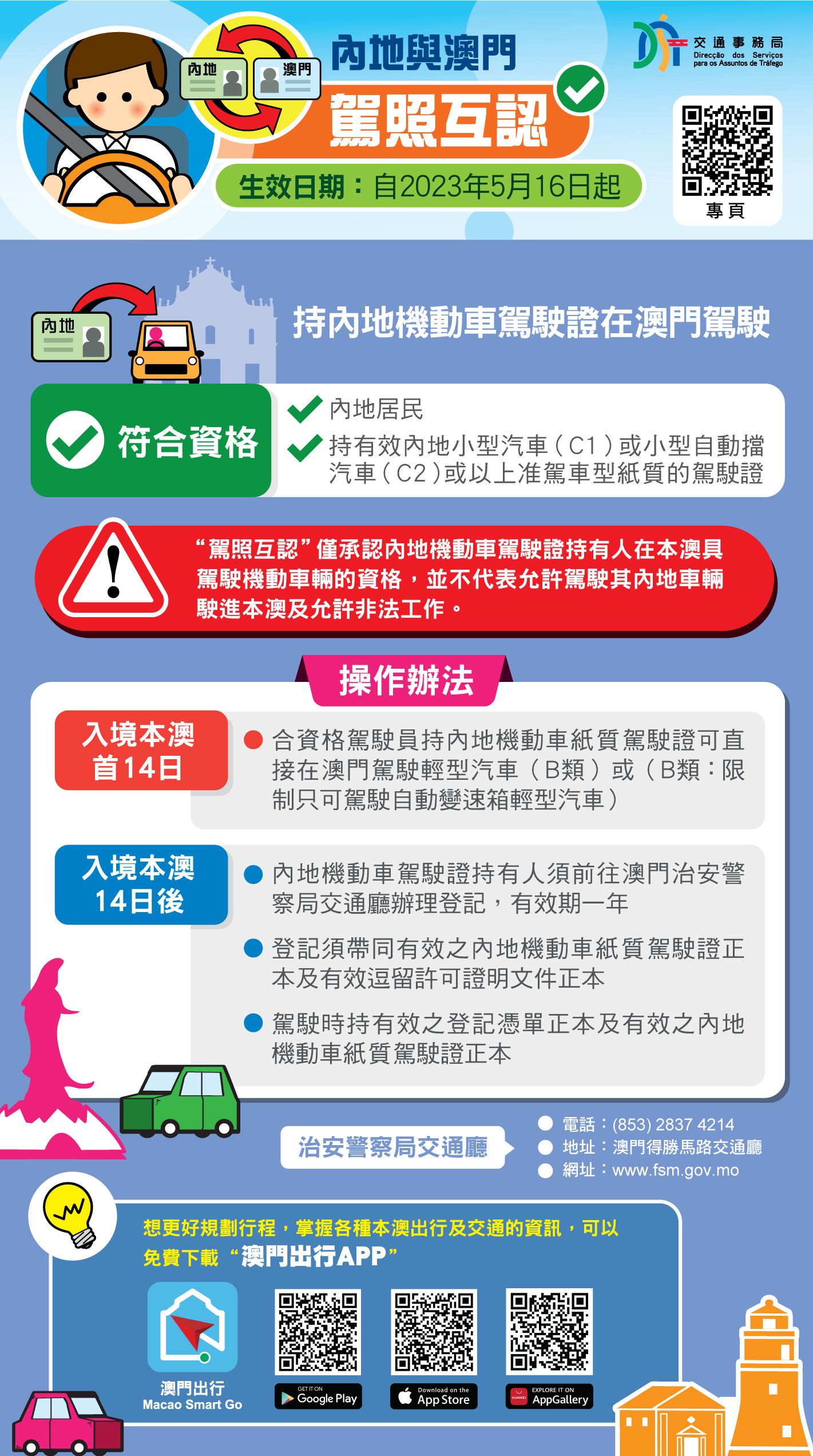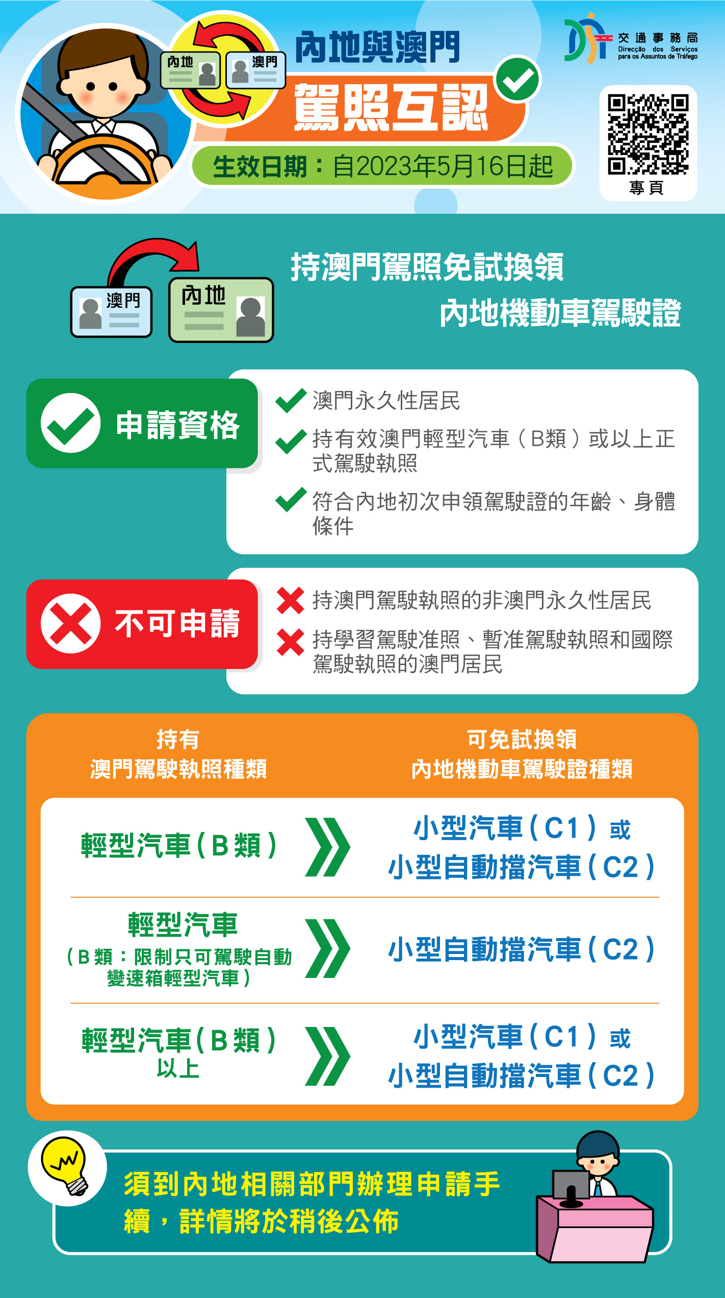 根據簽署的駕駛證互認換領協議,內地與澳門承認對方核發的有效駕駛證,一方准許持有對方駕駛證的人員直接駕車或者免試換領駕駛證。互認換領的駕駛證准駕車型包括小型汽車和小型自動擋汽車。對持有效正式澳門駕駛執照的澳門永久性居民,持正式澳門駕駛執照,以及身份證明原件、身體條件證明、照片,可以直接免試換領內地駕駛證,無需參加考試;持有效內地紙質駕駛證人員,在入境澳門14日內可直接駕駛規定車型,無需換領澳門駕駛執照;入境超過14日需繼續駕車的,經澳門治安警察局交通廳登記後一年內可以在澳門直接駕駛規定車型。