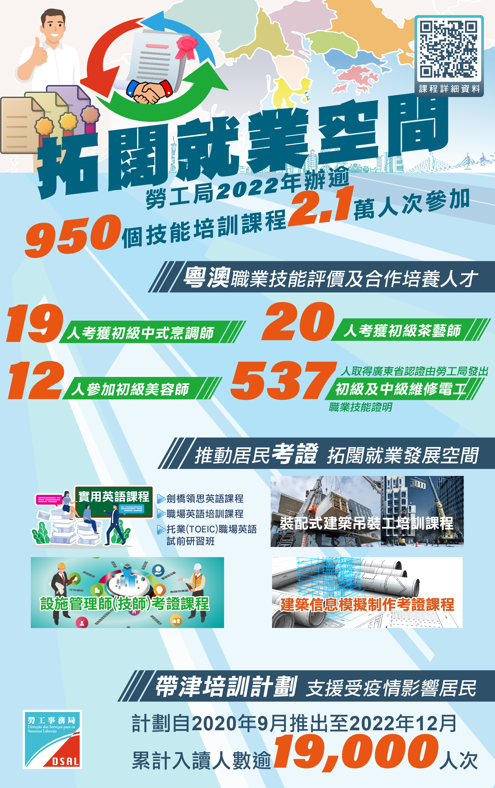 為配合本澳社會及經濟適度多元發展的需要,開辦不同範疇的提升技能課程,為各行業培訓技能人才,當中包括語言方面的培訓,為配合國際客源的擴充,提升從業員的英語能力水平,勞工事務局持續開辦職場及實用英語相關的考證課程,如“劍橋領思實用英語(口語) - 服務業英語會話培訓課程”、“劍橋領思職場英語(寫作)培訓課程”、“職場英語培訓課程 - 初級”、“職場英語培訓課程 - 中級”及“托業(TOEIC)職場英語聽力與閱讀考試試前研習班”,並計劃與各休閒企業合作,安排員工參與英語語言水平相關的考證項目,助力構建世界旅遊休閒中心。