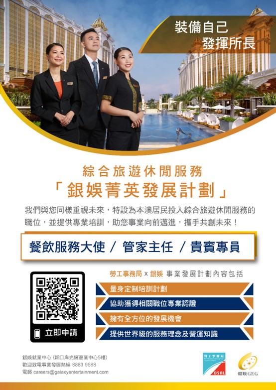 為建設澳門成為世界旅遊休閒中心,大型休閒企業陸續有高端休閒設施投入營運,同時將帶來不少職業前景廣闊的就業崗位。為協助本澳居民投身相關職位,勞工事務局與銀河娛樂集團(下稱“銀娛”)合辦“銀娛菁英發展計劃”(下稱“計劃”),培養綜合旅遊休閒服務人才。有興趣投身相關領域的本澳居民可於3月7日起進行網上報名申請。