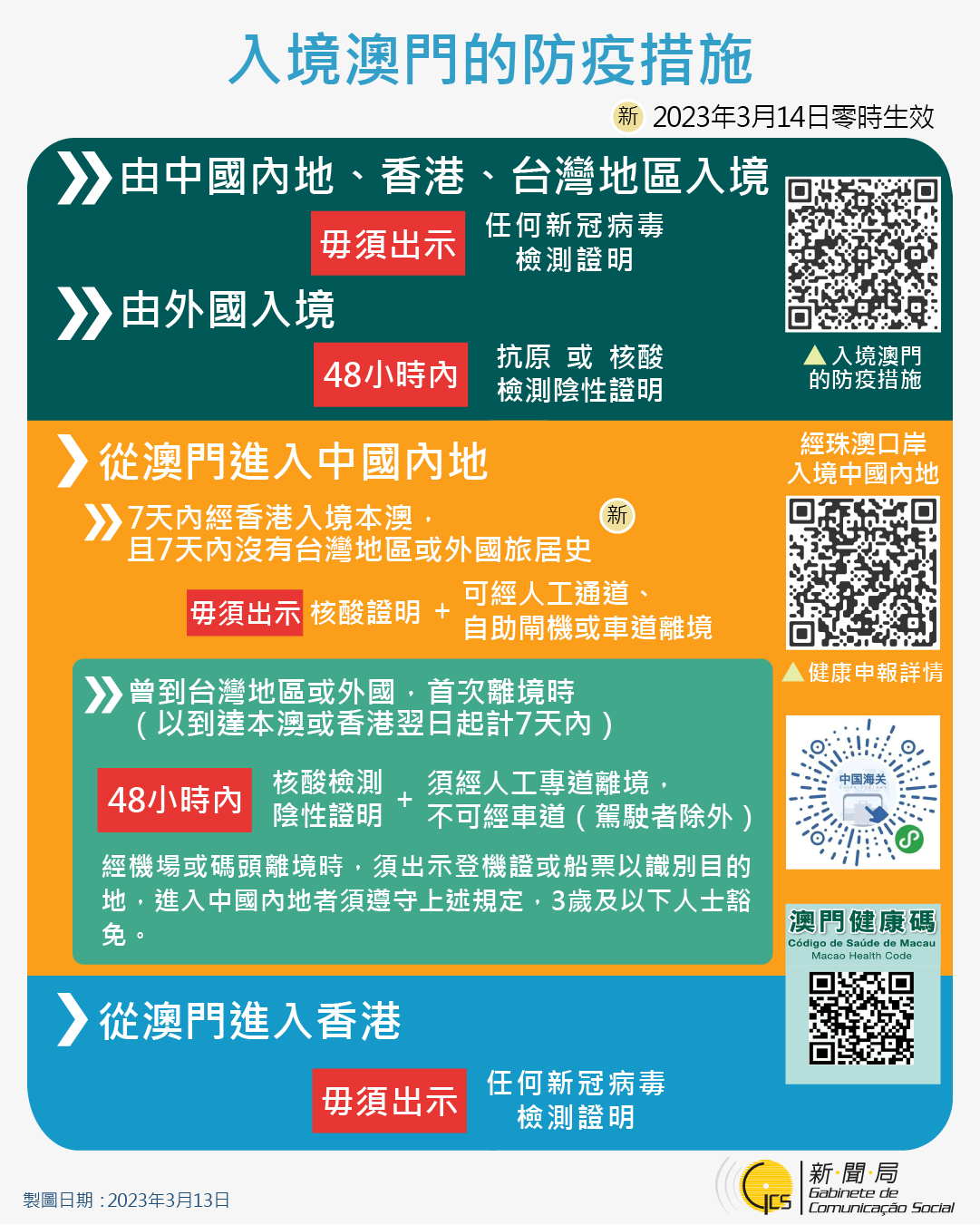 【圖文包】最新入境澳門的防疫措施 (2023/3/13)