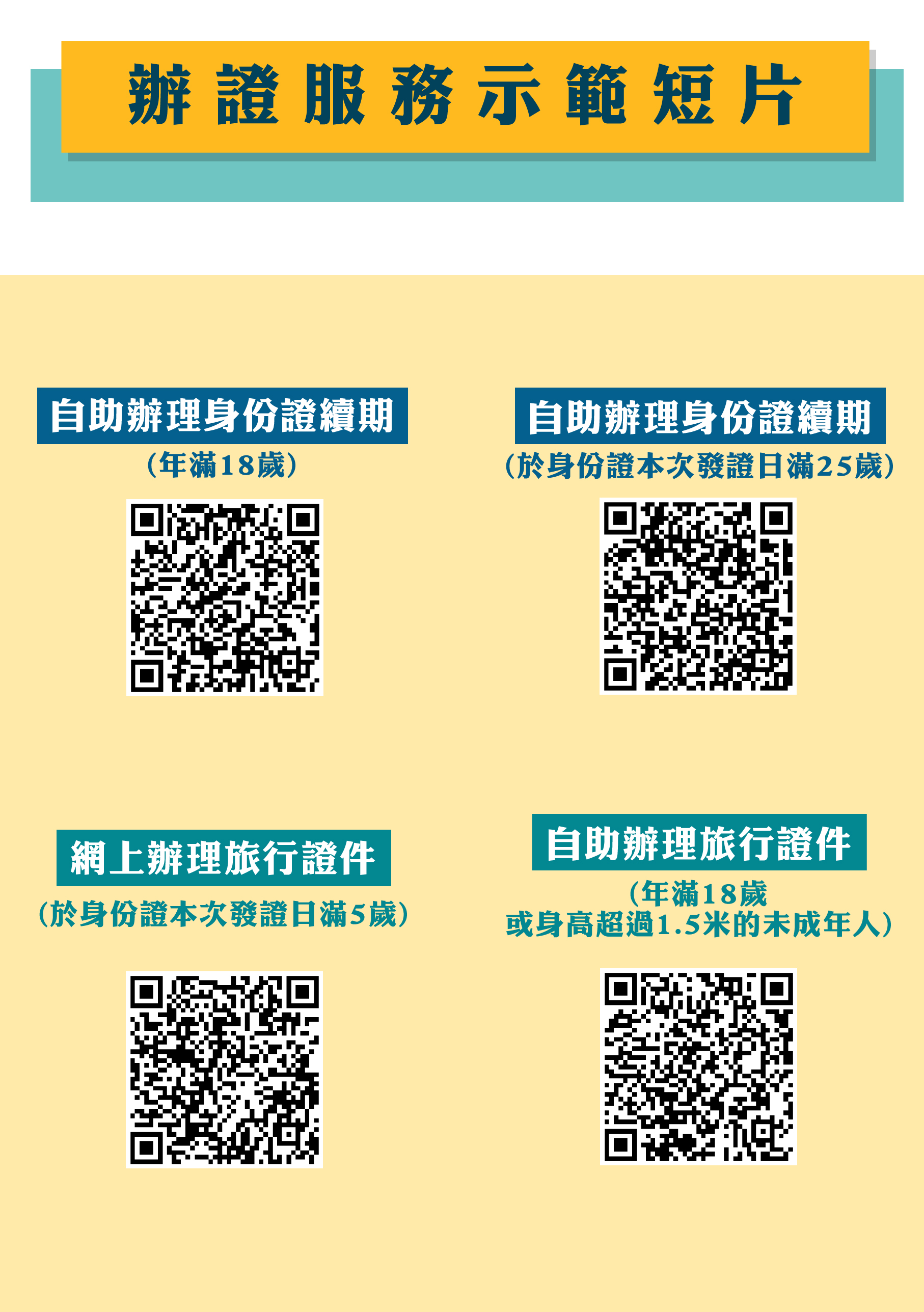 同時,亦建議合資格人士優先使用“一戶通”或自助服務機電子辦證,電子辦證服務的示範短片請掃瞄相關二維碼。如有查詢,可致電身份證明局熱線(2837-0777或2837-0888)或電郵至info@dsi.gov.mo。