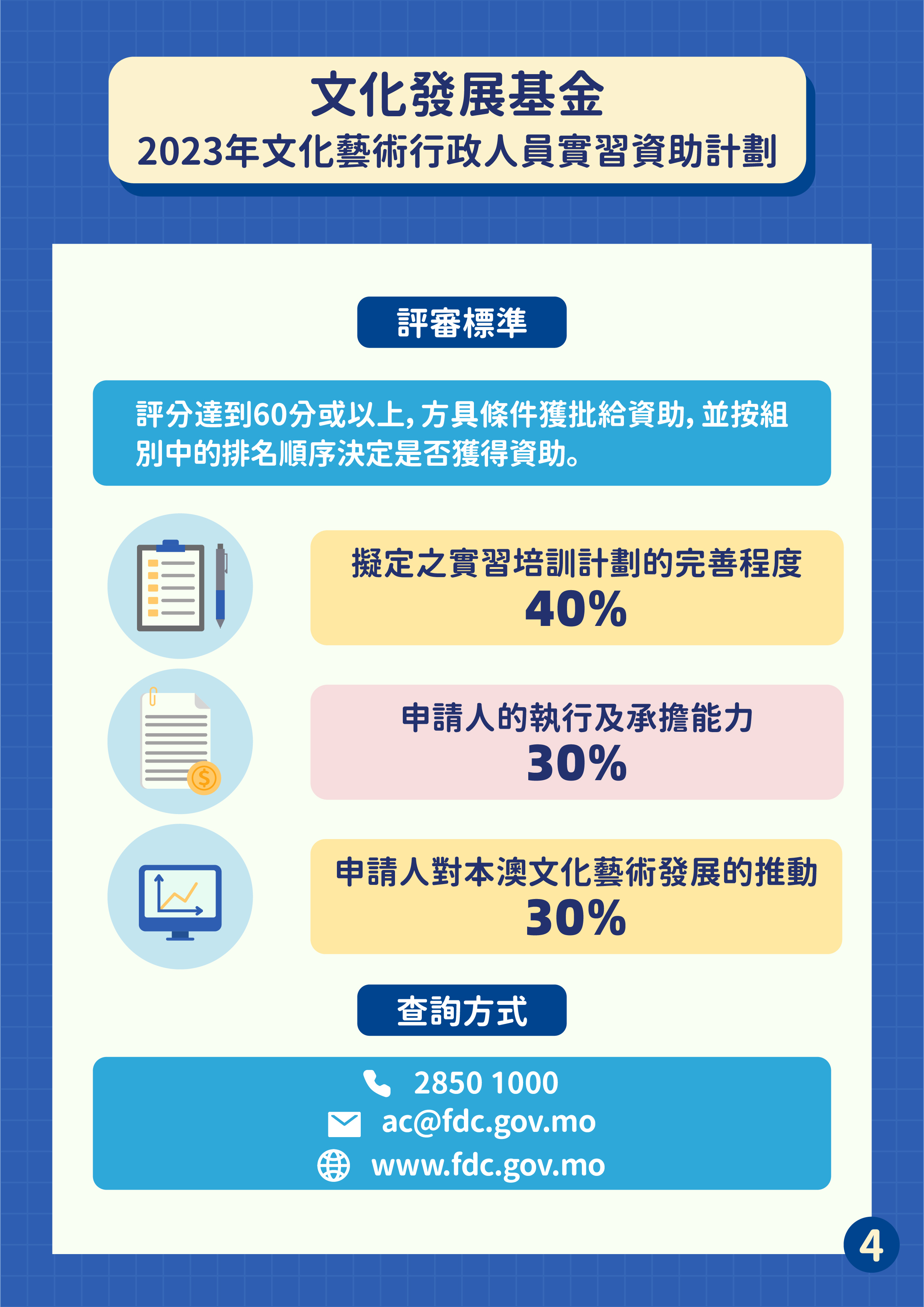 上述資助計劃的申請人須使用文化發展基金網上系統(www.fdc.gov.mo)的註冊帳戶,填寫申請表及上傳申請文件。為詳細介紹3個資助計劃的申請事宜及解答申請人問題,基金將於4月12日假澳門科學館會議廳舉行兩場專場講解會,第一場於上午10時舉行(文化藝術行政人員實習資助計劃、國家藝術基金配套計劃),第二場於下午3時舉行(文化旅遊品牌塑造資助計劃),有興趣人士請於基金網站(www.fdc.gov.mo)報名。查詢請致電8985 0862或電郵karenchoi@fdc.gov.mo。