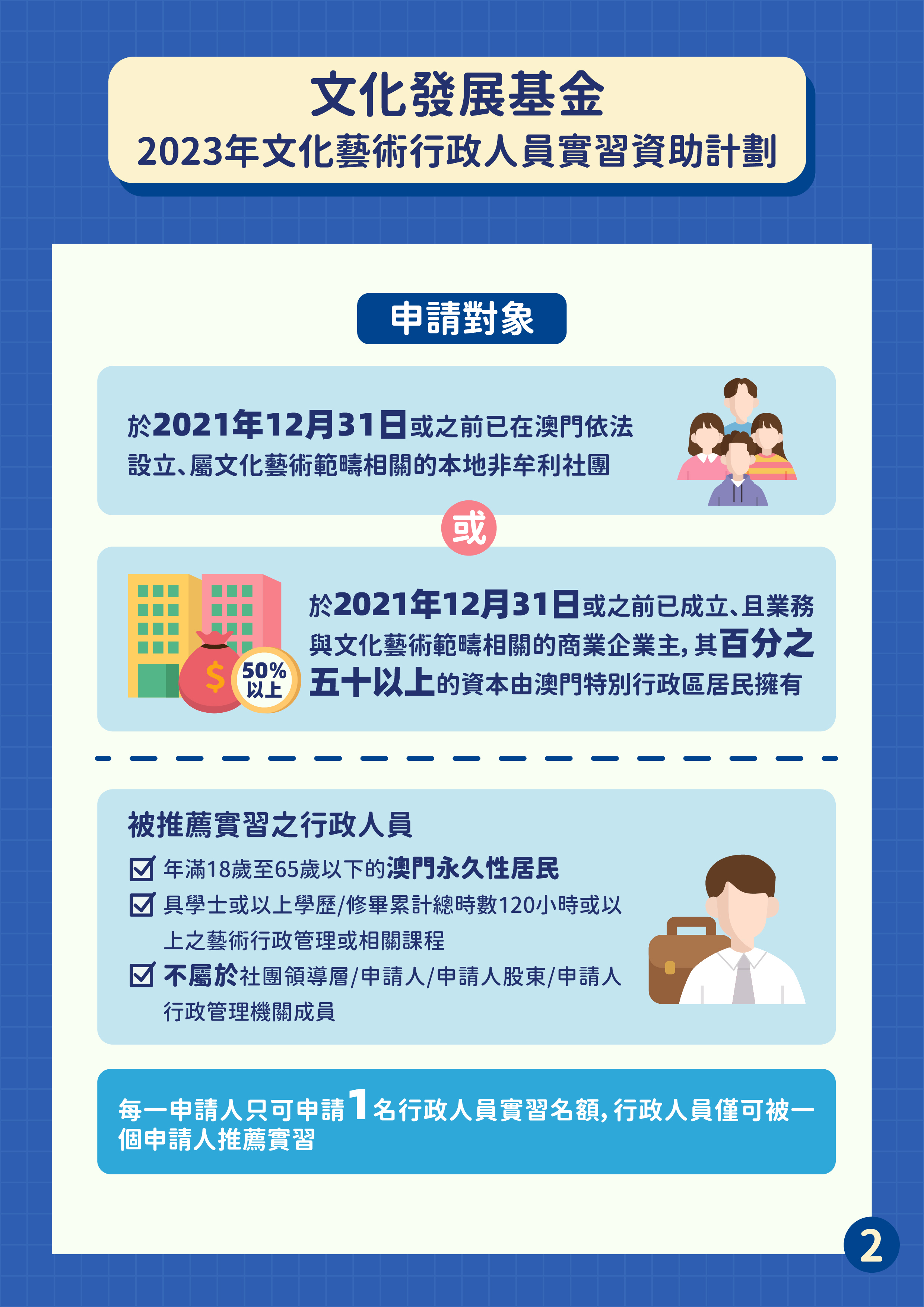 文化發展基金於4月11日至5月8日接受“文化藝術行政人員實習資助計劃”的申請,鼓勵本澳文化藝術社團或商業企業提供實習機會,培養文化藝術活動策劃、統籌、行政及技術等範疇的行政人員。本項計劃是以補貼形式資助經由申請人推薦的1名澳門永久性居民行政人員的實習費用。資助名額80個,包括社團組別上限70個及商業企業組別上限10個。