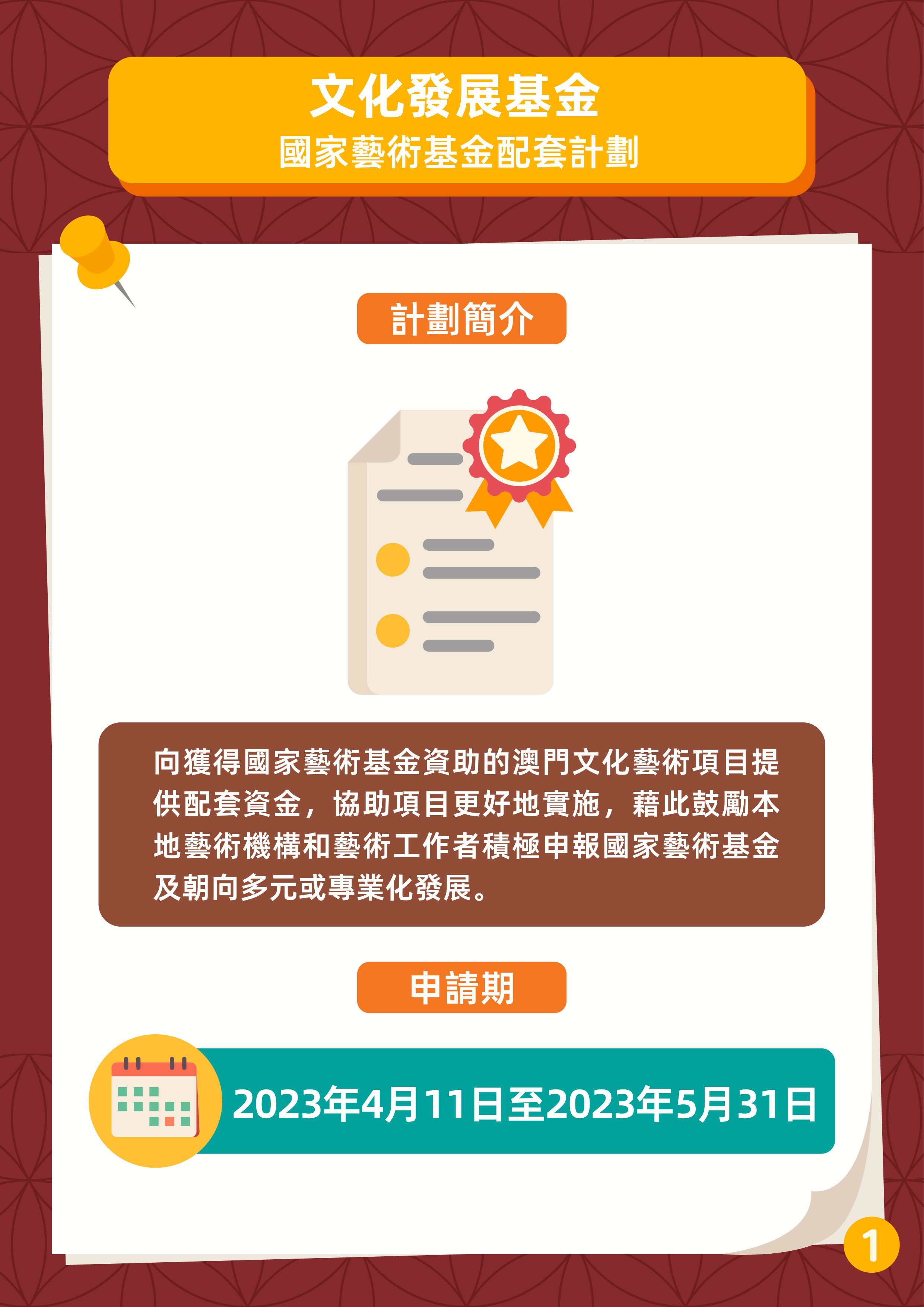 為支持獲得國家藝術基金資助的澳門文化藝術項目落實執行及鼓勵澳門藝術機構和藝術工作者積極申報國家藝術基金,文化發展基金推出“國家藝術基金配套計劃”,申請期由4月11日至5月31日,接受本項計劃申請期首日開始時(即2023年4月11日)尚未向國家藝術基金提交結項的澳門特區項目的申請。配套計劃為補貼形式,不限名額。