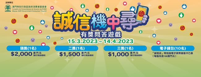 為增加獲獎機會,參加人士可於“誠信店”應用程式及消委會網頁(www.consumer.gov.mo)內找到問題答案。