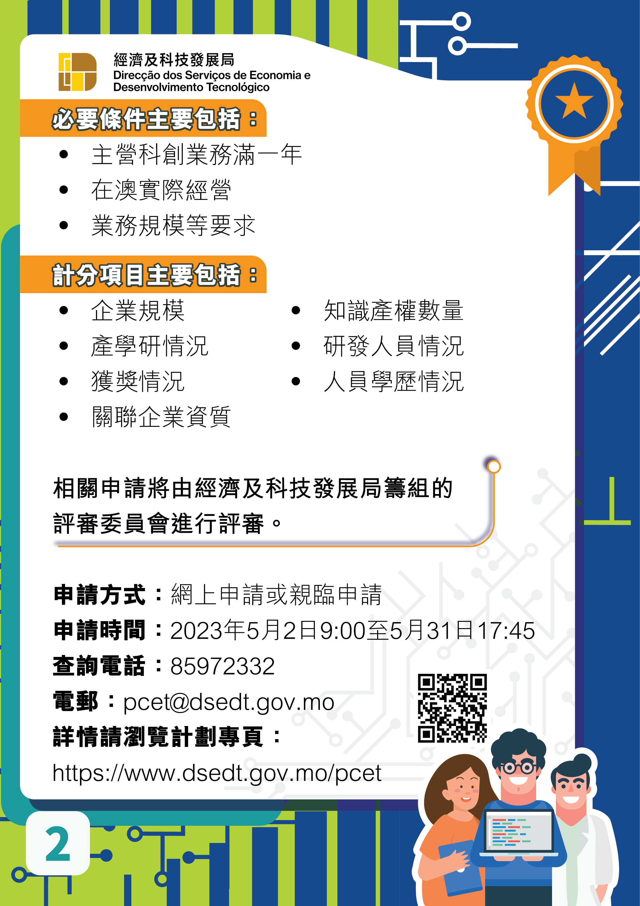 本次計劃申請期為5月2日至31日,申請者可透過經科局網上系統提交申請,詳情可瀏覽計劃專頁(https://www.dsedt.gov.mo/pcet),或致電8597 2332查詢。