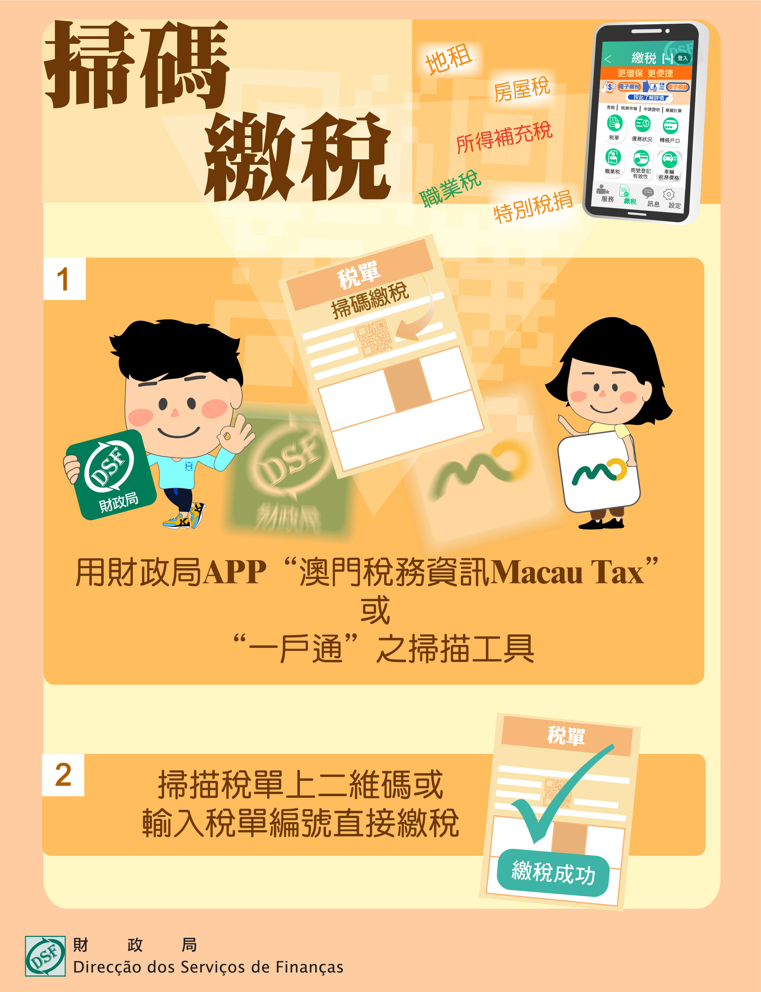 市民可使用財政局App“澳門稅務資訊Macau Tax”或 “一戶通”之掃描工具,掃描稅單上二維碼或輸入稅單編號直接繳稅,方便快捷。另外,市民亦可登錄上述App,查詢未繳納之稅單,並可直接透過電子支付繳納稅款。