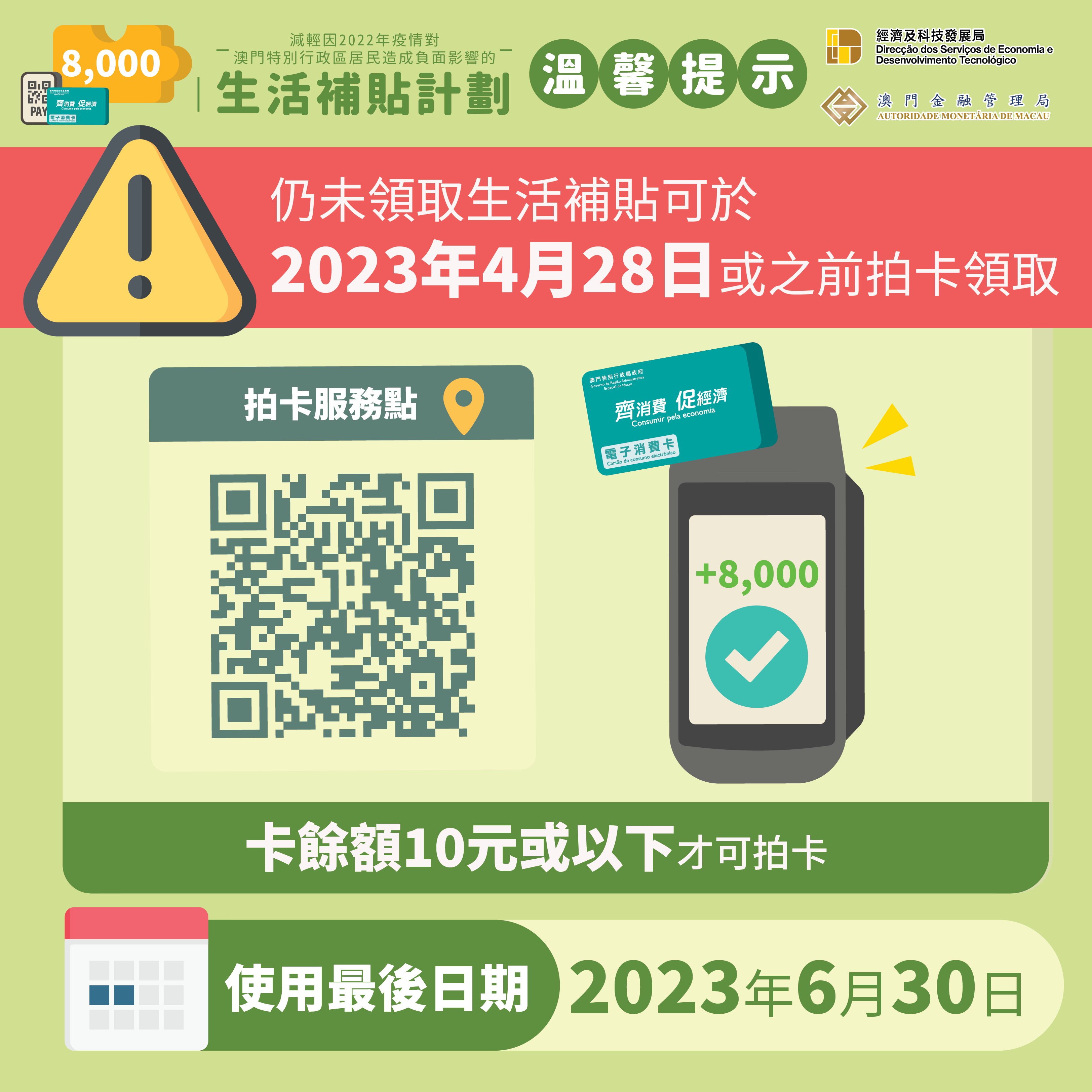 “生活補貼計劃”的最後拍卡領取日為2023年4月28日,特區政府呼籲,使用消費卡且已獲取第三輪抗疫電子消費優惠的合資格居民,如仍未領取8,000元生活補貼,最遲於明(28)日拍卡領取。