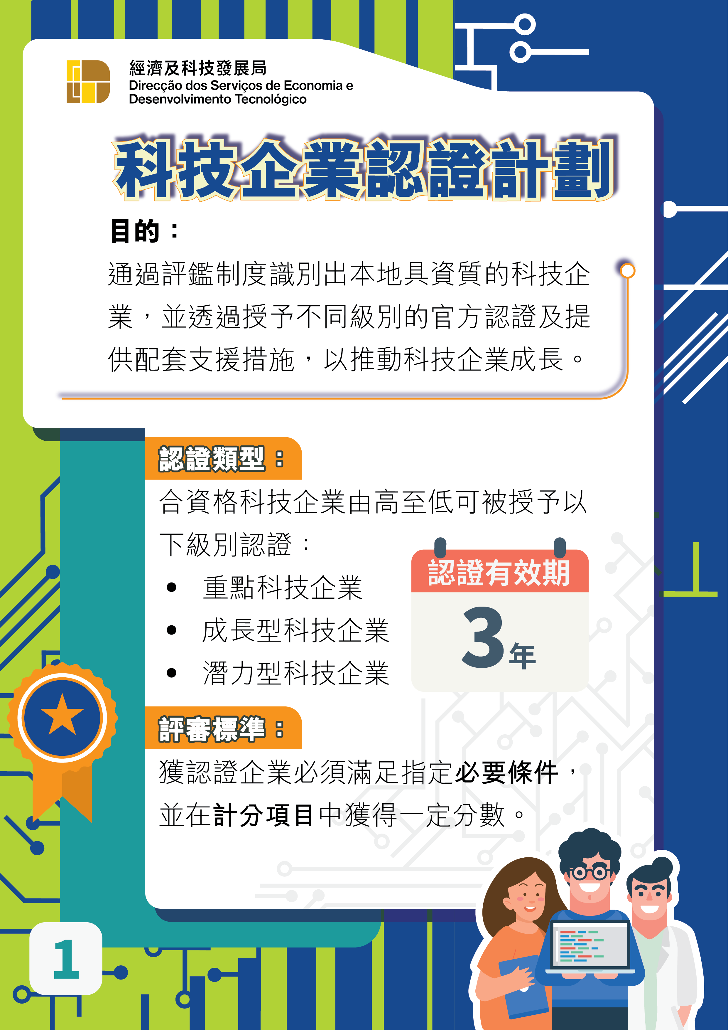 《科技企業認證計劃》通過評鑑制度識別出本地具資質的科技企業,並透過為其提供不同級別的官方認證,推動相關企業擴展業務,同時配合特區政府提供的各類型支持措施,為本澳科技企業構築成長階梯,助力企業發展。《科技企業認證計劃》將由評審委員會對申請企業進行多維度的評審,並按結果授予不同級別的科技企業認證。