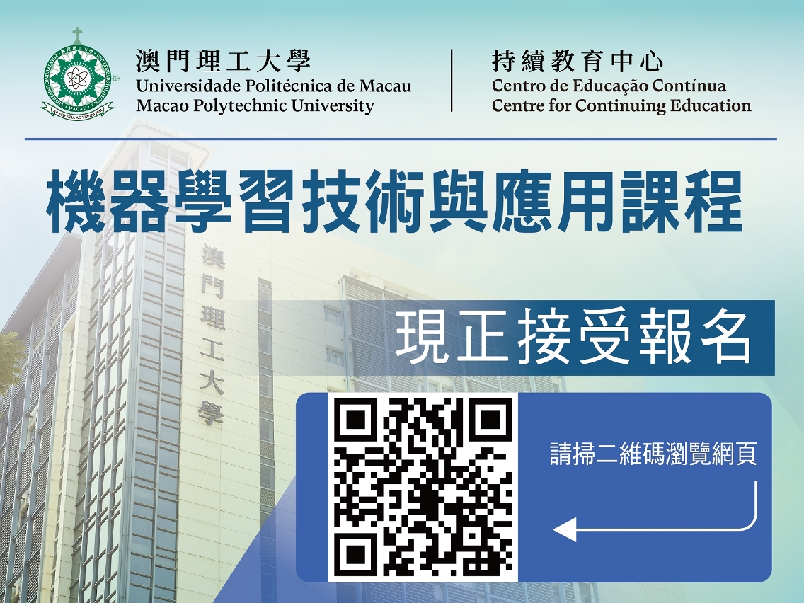 “機器學習技術與應用”課程內容包括介紹機器學習、監督學習及無監督學習、線性回歸、邏輯回歸、神經網絡、深度學習及應用個案示範等。課程以廣東話授課,可使用教育及青年發展局持續進修發展計劃個人進修帳戶支付。出席率達總課時85%並通過評測可獲由澳門理工大學持續教育中心發出的證書。